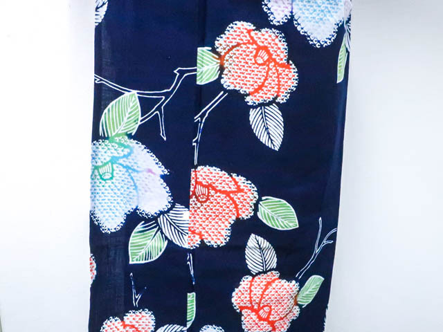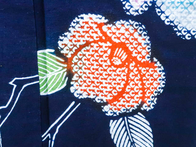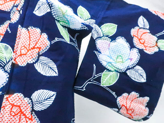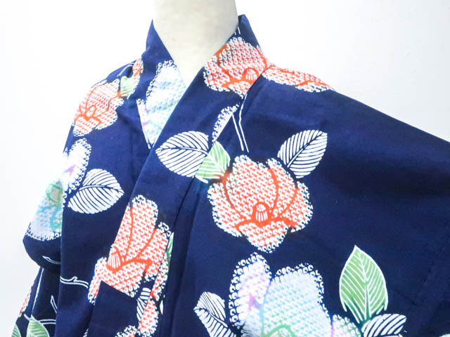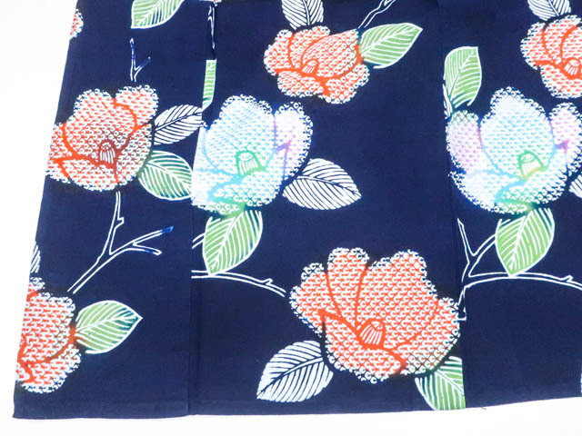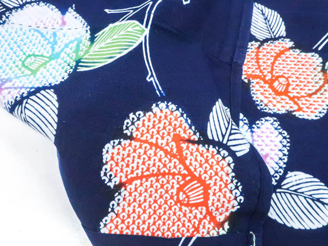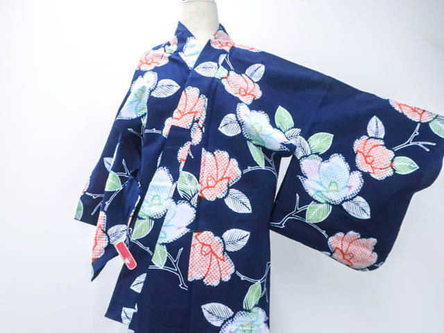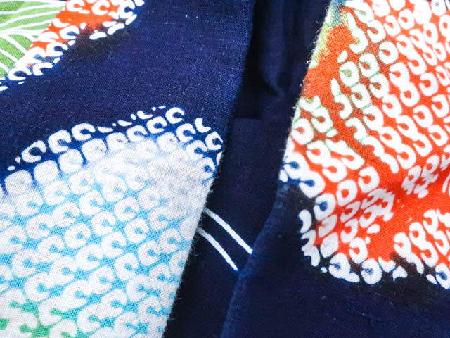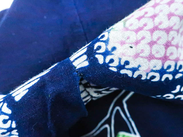 肩当て付きです。 リサイクル商品のため、右脇にほつれ、衿折山、裾、肩辺りに擦れがございますが着用可能なお品です。 地色は紺です。 1枚目の画像が近いお色かと思われます。 素材は綿です。 |