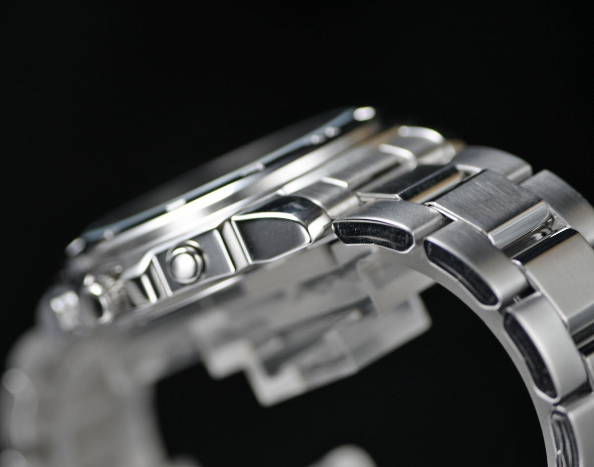 ケースは丁寧にポリッシュメントを施された鏡面加工のピュアステンレスで質感を感じさせます。
