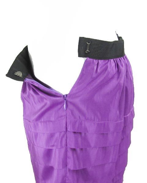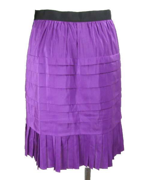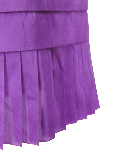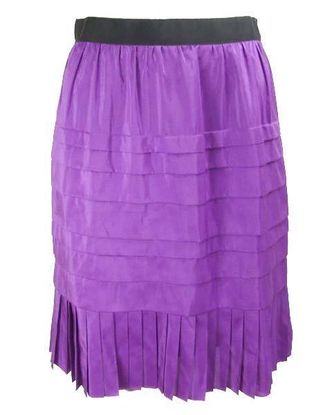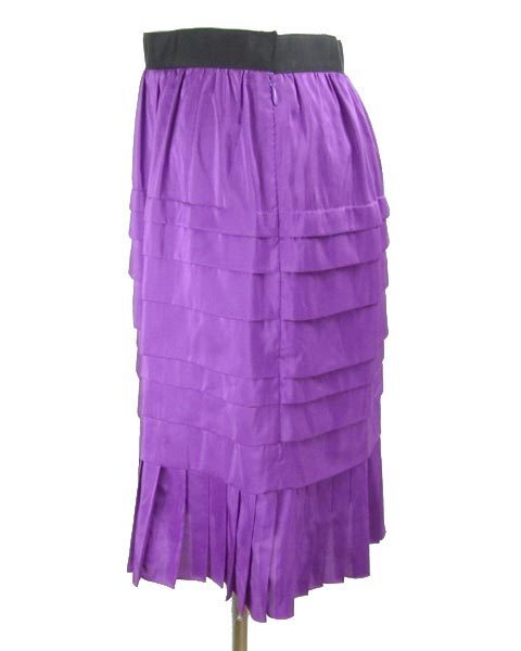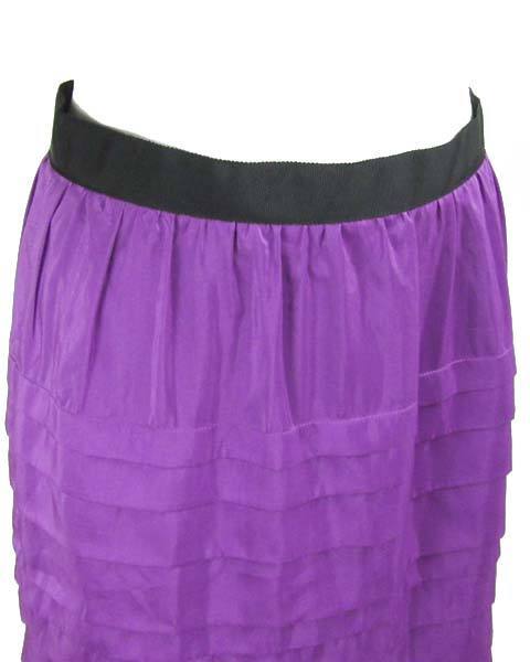 | 光沢のある薄手生地の華やかなパープルのスカート。横ひだと縦ひだの組み合わせが絶妙で、大人可愛いデザインです。ウエストの黒が全体を引き締めています。シックなお色のトップスとも、白ともあわせて頂けて大人スタイルが楽しめます。 |