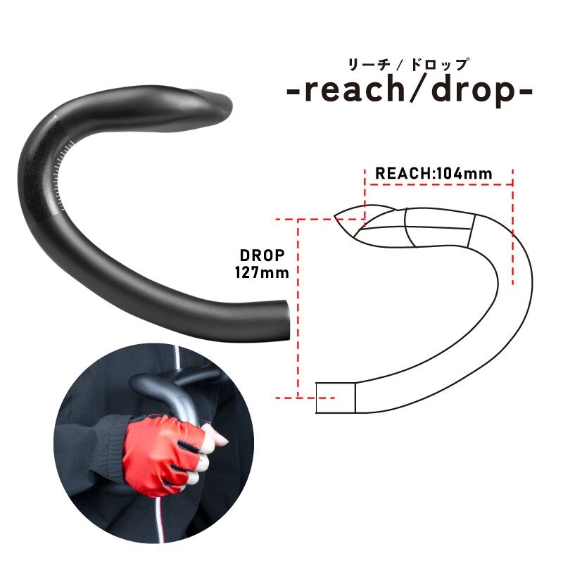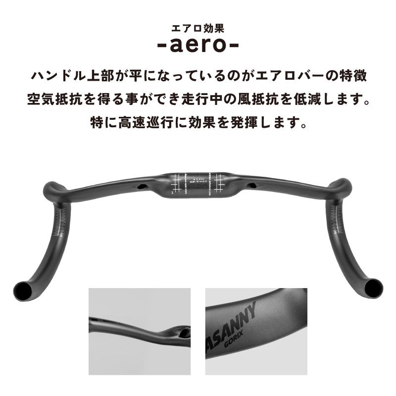 走行中前面からの空気抵抗を軽減するエアロハンドル。 ハンドルは通常丸形状ですが平形状にする事で空気抵抗の削減。 向かい風でも強い味方です。特に高速巡行に効果を発揮します。 またカーボン素材で作られているため軽量で高強度そして耐久性に優れています。 艶消しマットブラックで見た目もかっこいいエアロカーボンハンドル。 ケーブルを内蔵できる穴もあるのですっきりとしたハンドル周りにもなります。 ロードバイクのハンドル交換に最適なエアロハンドルです。エアロ化に! [エアロ] 空気抵抗を抑えるためにハンドル上部は平になっているのが特徴です。 最高の防風効果を得る事ができ走行中の風抵抗を低減します。 特に高速巡行に効果を発揮します。 [カーボン] 超軽量で高強度のカーボンファイバー素材。振動を吸収し長時間の乗車でも振動によるストレスを軽減し快適に。 一体成型炭素繊維素材 【耐久性】【高強度】【超軽量】 [ケーブル内蔵穴] ケーブルを通す穴を設けているのでケーブルをハンドル内に通す事が可能に。見た目もすっきり。 商品内容カーボンエアロハンドル 材質カーボンファイバー 幅380mm クランプ径φ31.8mm フレア6° ドロップ127mm リーチ104mm 重量約210g(※400mm) ケーブル内部配線用穴あり | |