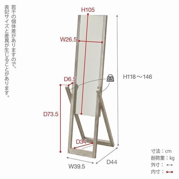 | 【カラー】 ナチュラル 【サイズ】 <外寸> 幅39.5×奥行44×高さ118~146cm <内寸> ミラー:幅26.5×高さ105cm フック:出幅6.5×高さ73.5cm 脚間:奥行34cm 【材質】 本体:プリント紙化粧繊維板 【耐荷重】 フック:各2.5kg以下 【生産国】 中国 【梱包】 サイズ:112×37×9cm、重量:10.2kg 【その他】 ・背面化粧有り ・ミラー高さ4段階調節可能 【組み立て品】 お客様による組み立てが必要です。 【ご注意】 サイズ、重量は概算です。 |