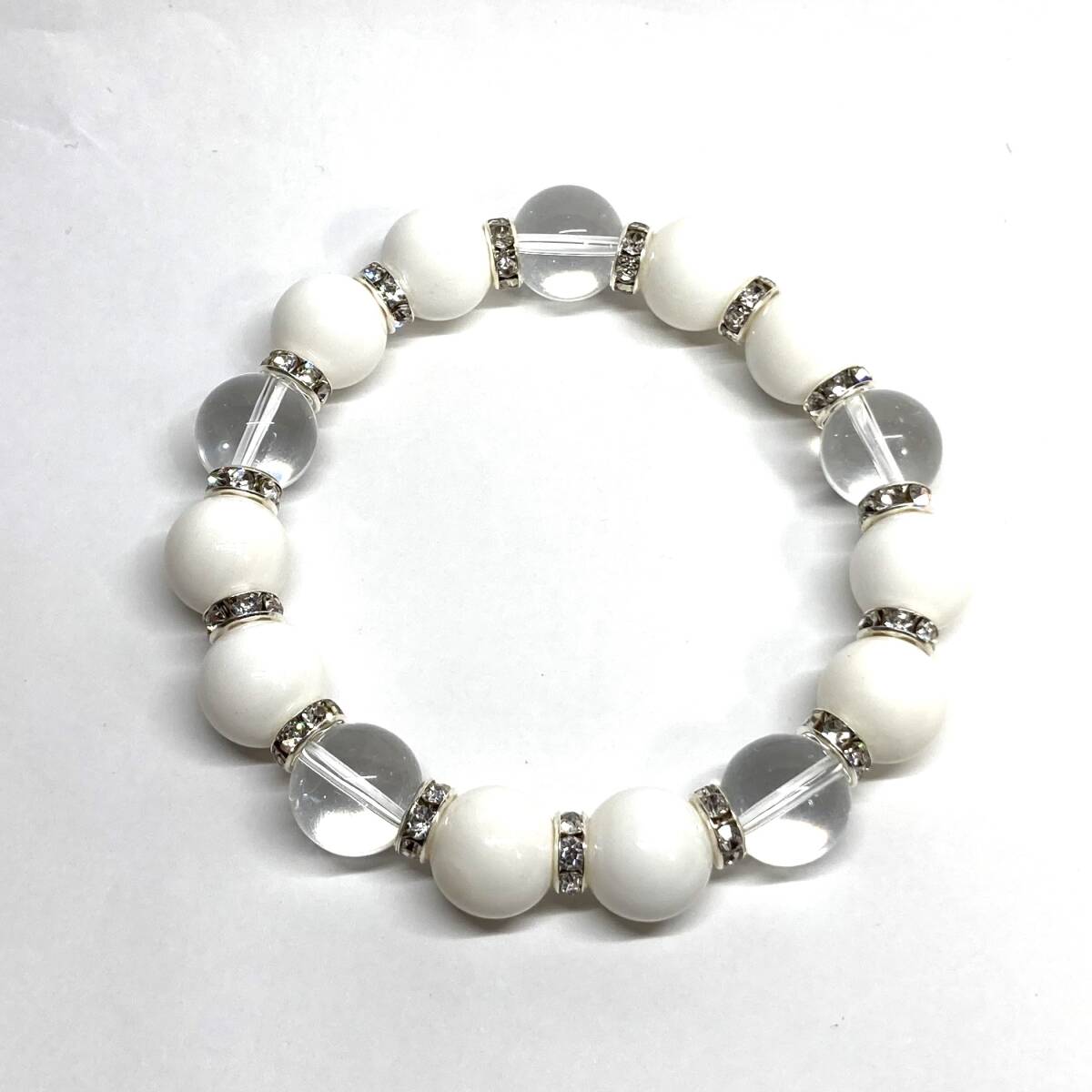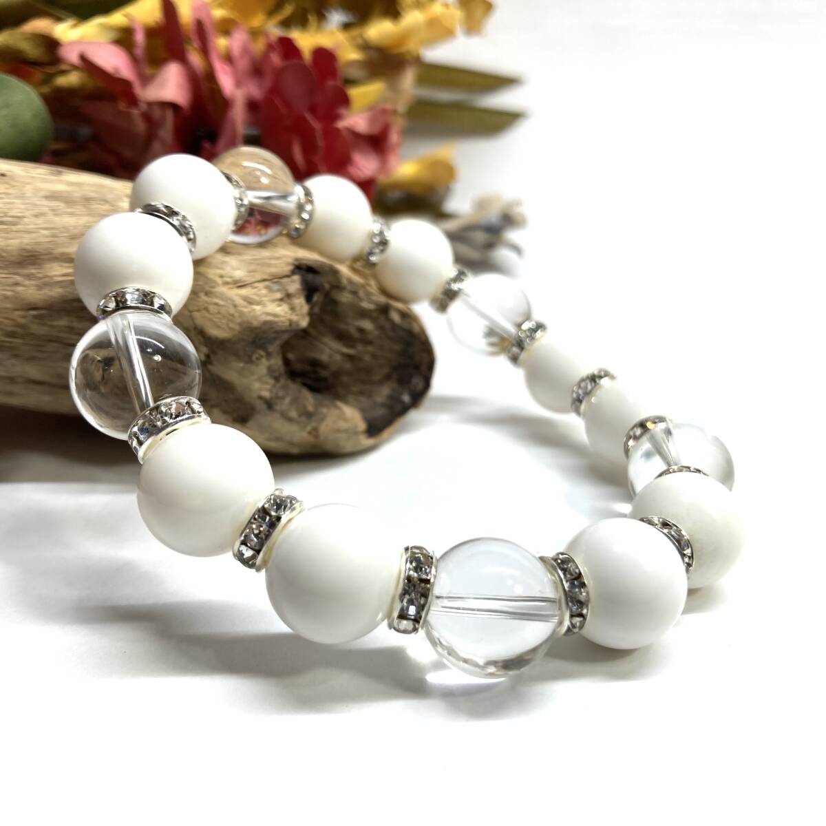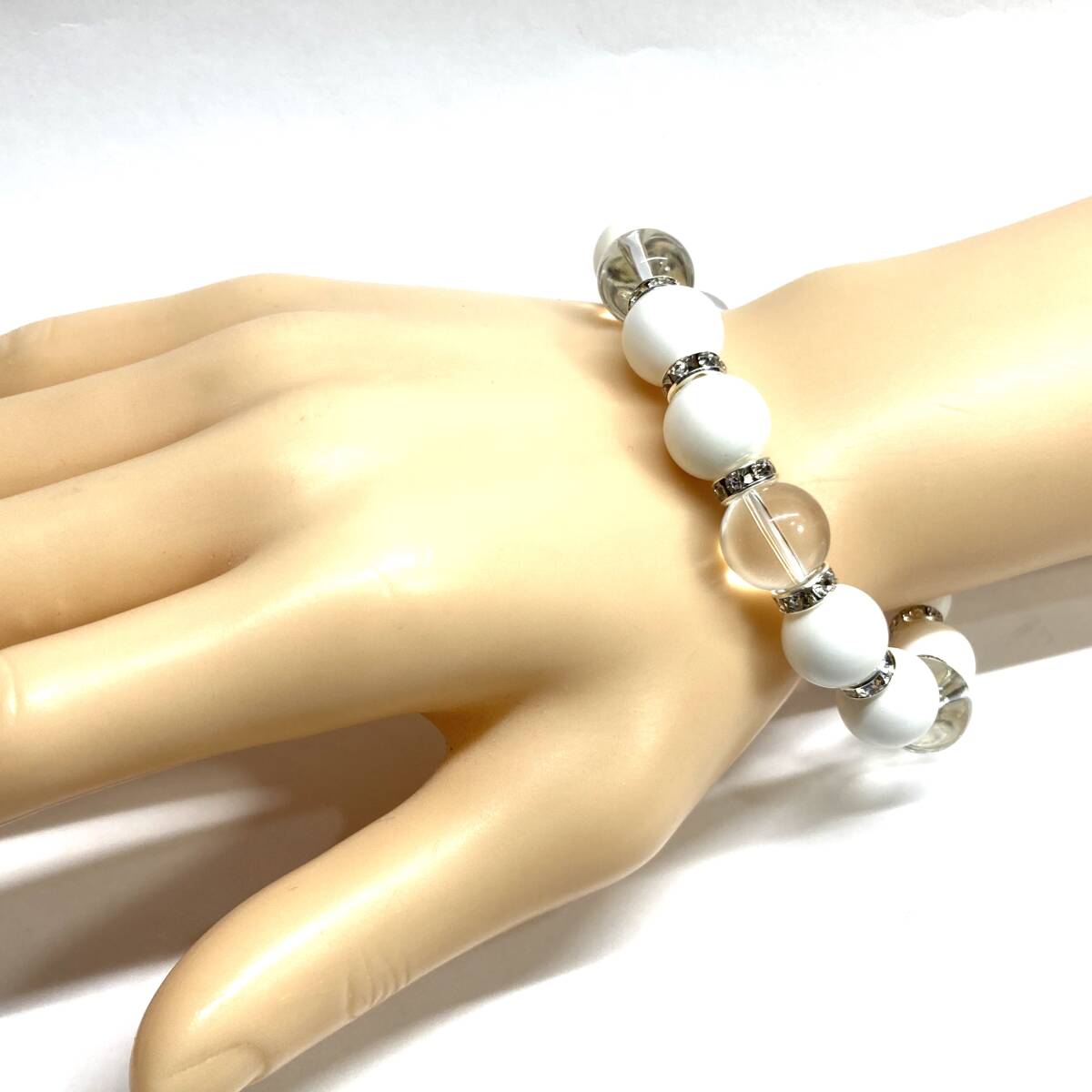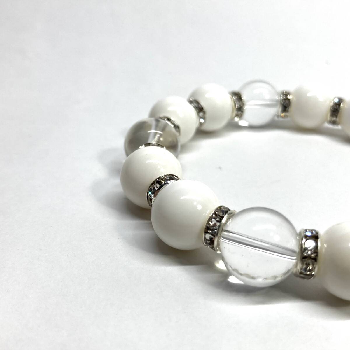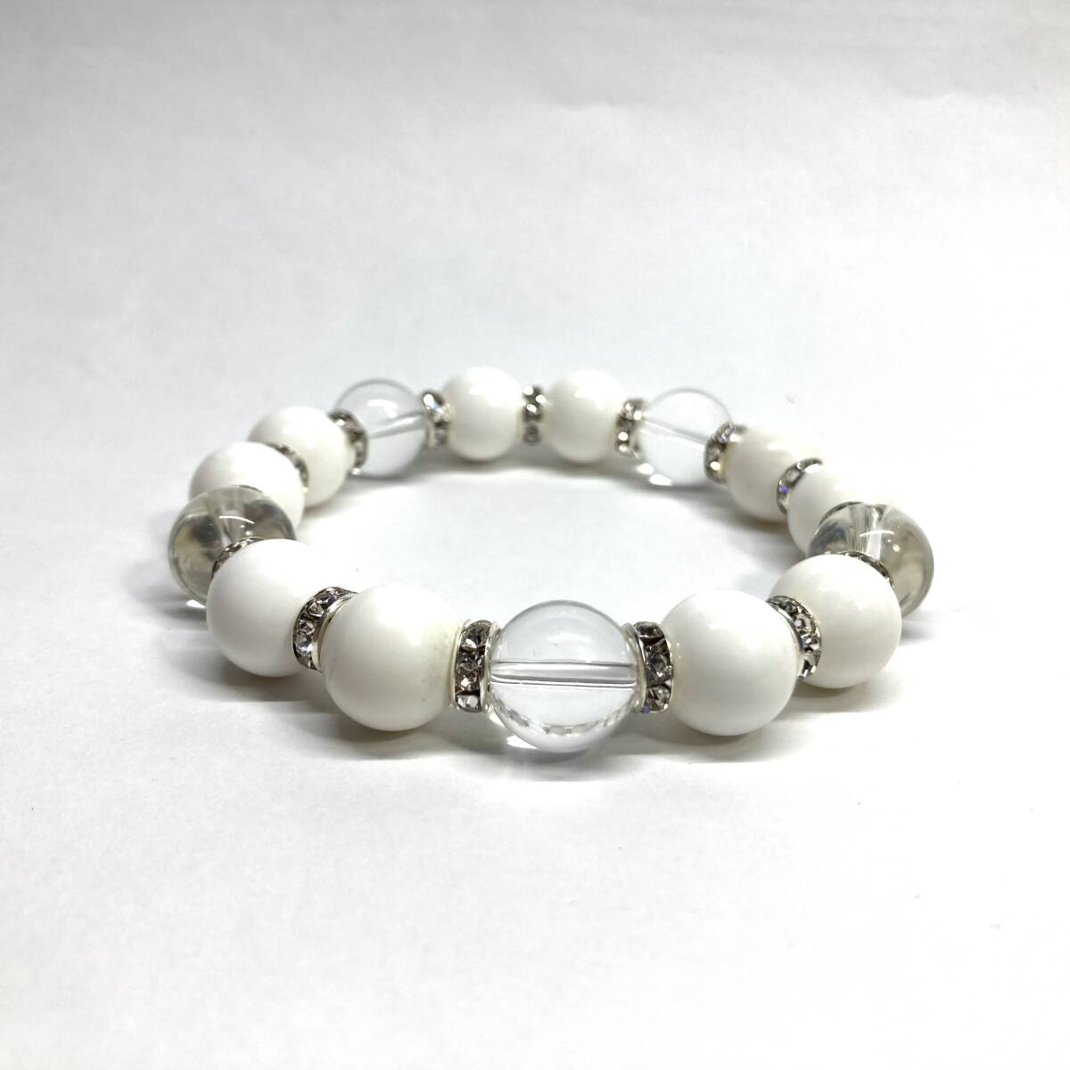 こちらは、ホワイトオニキスと水晶を組み合わせたパワーストーンブレスレットです。間にはロンデルを挟み高級感あるデザインに仕上げております。程よくインパクトがある12mm玉を使用して内周約18cmです。(サイズ変更の場合は取引ナビにてご連絡をお願いします。) 数に限りがございますので気になる方はお早めにどうぞ。