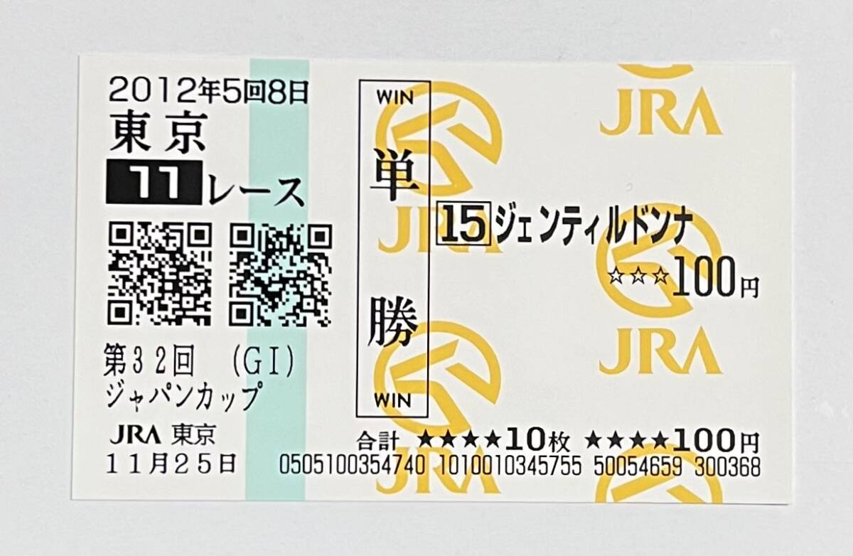 2012年 ジャパンカップ 優勝馬 ジェンティルドンナの現地単勝馬券(特別版)です。送料として定形郵便110円のご負担をお願いします。郵送事故等の責任は負いかねます。ノークレーム、ノーリターンでお願いします。