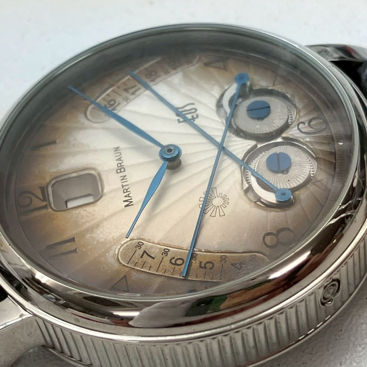 取り扱っている商品は未使用・未開封も含め、全て一度は人の手に渡った一点ものの中古・ジャンク扱いでの商品です。 当方素人ですので肉眼で確認できる簡易的な検品、採寸、および簡易梱包となります。 ※稼働の記載につきましては秒針等の確認のみとなり、全体の動作を保証するものではございません。 また、出品時の中古品の動作状況となりますので、予めご了承の上でご入札ください。 不動の表記につきましてはクォーツ式のムーブメントの場合、動作未確認の状態となります。 電池交換後、不具合があった場合でも返金、返品の対象とはなりませんので、予めご了承くださいますようお願い致します。 細かな日差、オーバーホール状況、社外パーツの使用に関しては保証しかねますので、ご理解いただけた上でのご入札をお願い致します。 上記を踏まえた上で中古品、ジャンク商品として出品させていただいておりますので、全てご理解いただけた上でのご入札をお願いいたします ------------------------------------------------------------------------- 【メーカー】 MARTIN BRAUN 【モデル名】 EOS 【型番】 42S 【シリアル】 067 【サイズ】 直径約4.2cm 腕回り約16~20.5cm 【付属品】 画像参照 【稼働状態】 不動 【その他状態】 リューズ動作 時間:OK 日付:OK 曜日:- ------------------------------------------------------------------------- 画像にあるものが全てです。 他詳細は画像にてご判断ください。 ※目立つ傷や汚れを中心に写真を撮っておりますが、画像に写りきっていない傷等がある場合もございます。予めご了承ください。 ※商品を多数出品している関係で、稀に商品説明や画像に誤りがある場合がございます。予めご了承ください。 こちらのページをご覧いただく際は、商品説明文と掲載している画像の全てを確認いただいた上でご入札ください。 | |||||||