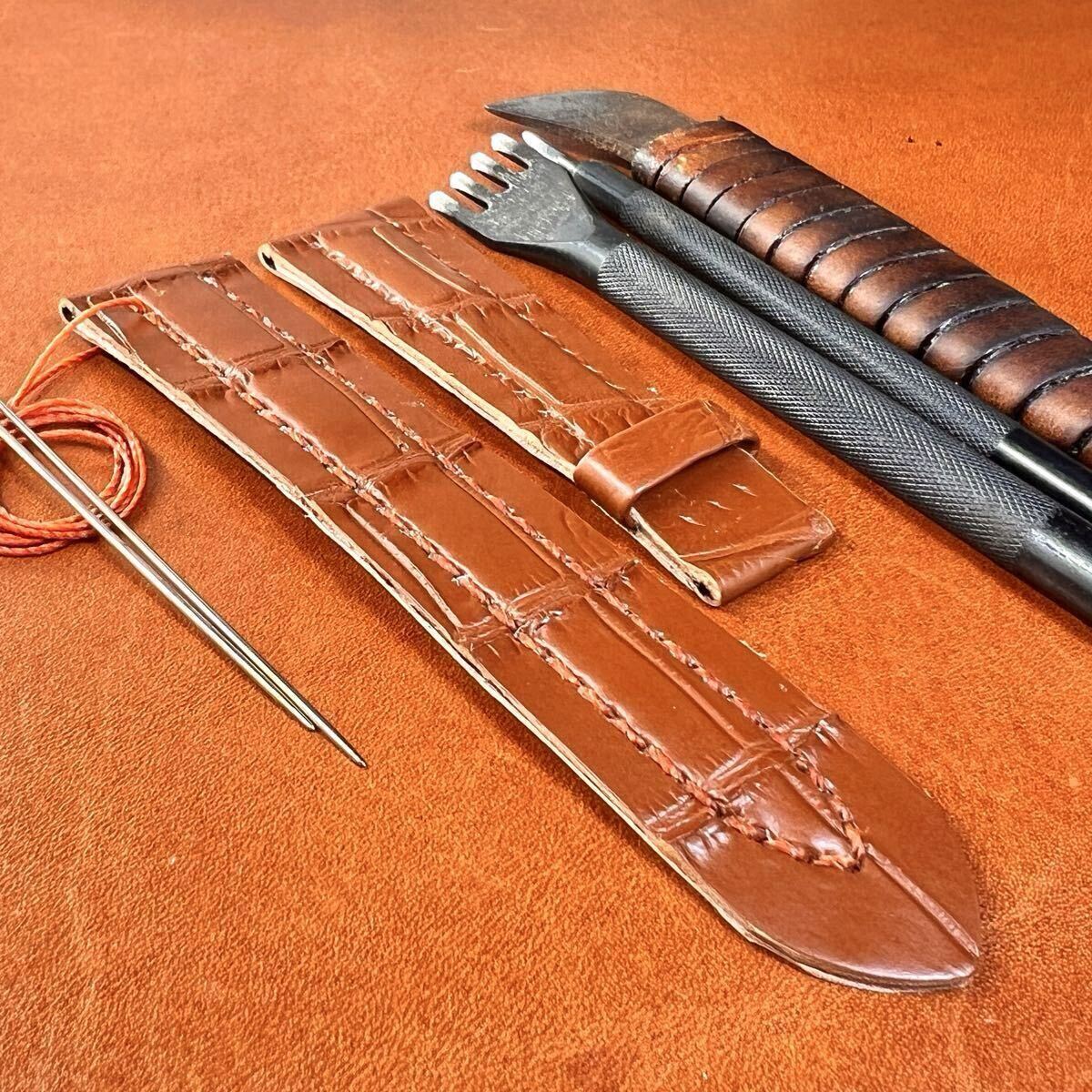 *竹斑模様が美しい良質なクロコダイル本革を使用しています。色はライトレッドブラウン。裏革はライトブラウンで、縫い糸はオレンジ色。