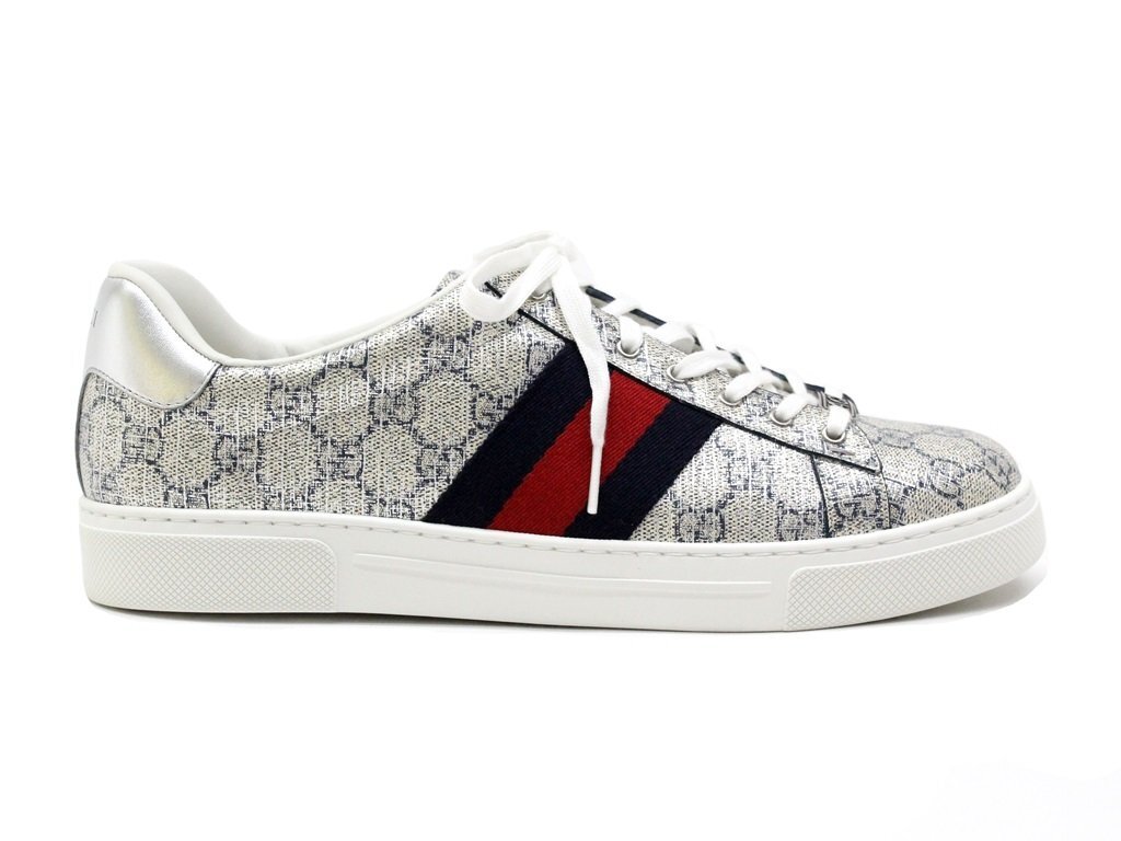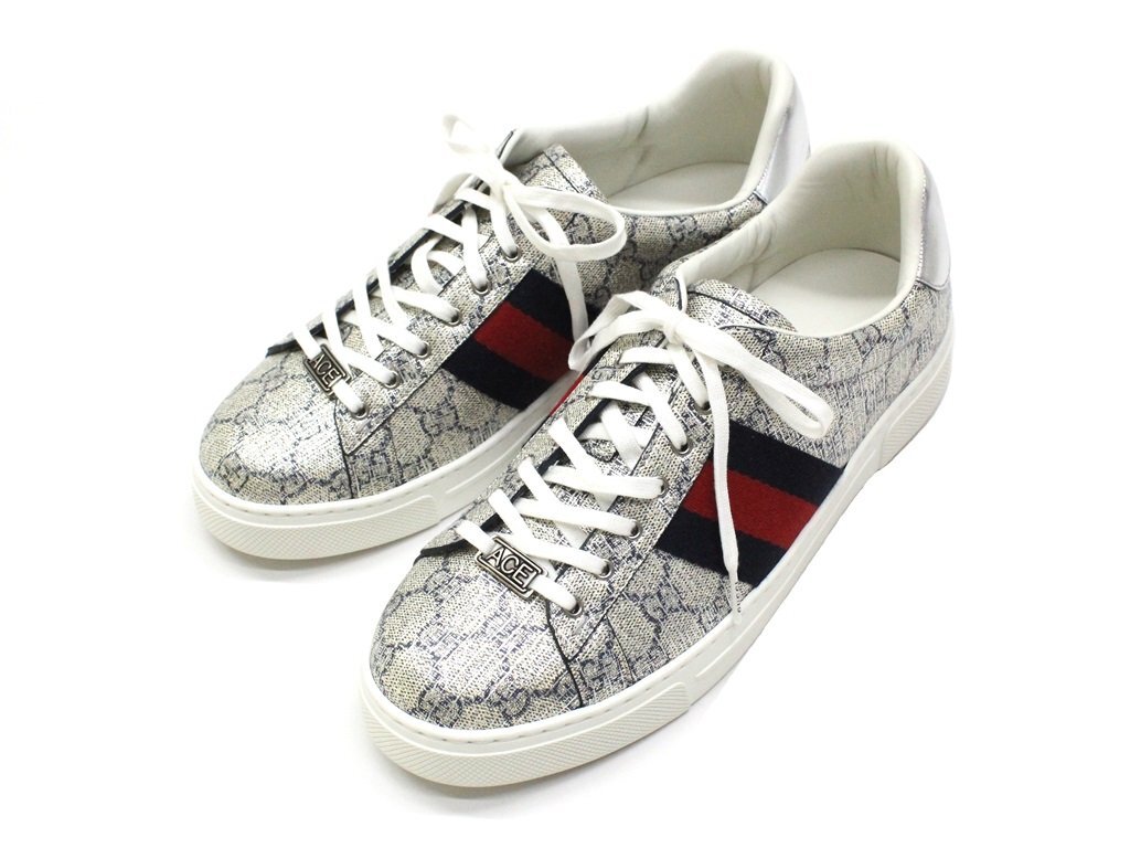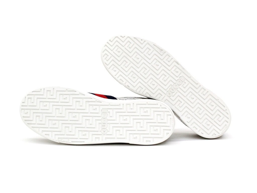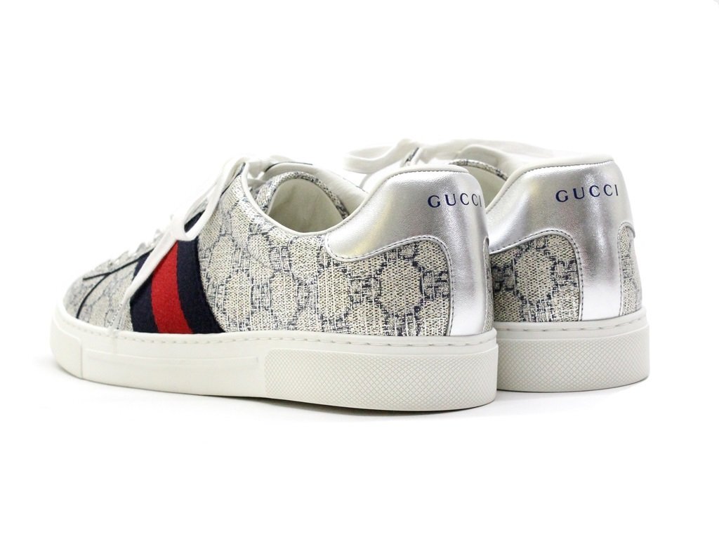 15万新品◆8=27cm◆GUCCI グッチ インターロッキングGGロゴプリント ウェブストライプ レースアップスニーカー シルバー銀