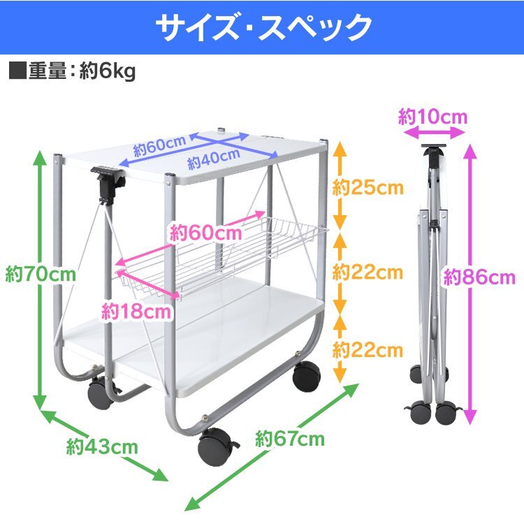 | 折りたためるキャスター付きのキッチンワゴン。 組み立てはとっても簡単!4つのキャスターを取り付けるだけ! キッチン以外にも大活躍! 様々なシーンでご利用いただけます。 幅10cmなので、狭い隙間でも収納しやすく移動も楽々。 使わないときは狭い隙間にスッと入れて保管が可能。場所を取りません。 ●商品仕様 サイズ(約):高さ70cm×幅67cm×奥行43cm(設置時外寸) 高さ86cm×幅67cm×奥行10cm(折りたたみ時外寸) ●注意事項 組み立て(折りたたみ→設置)の際は、手を挟まないようにご注意ください。 |