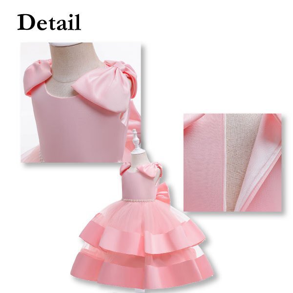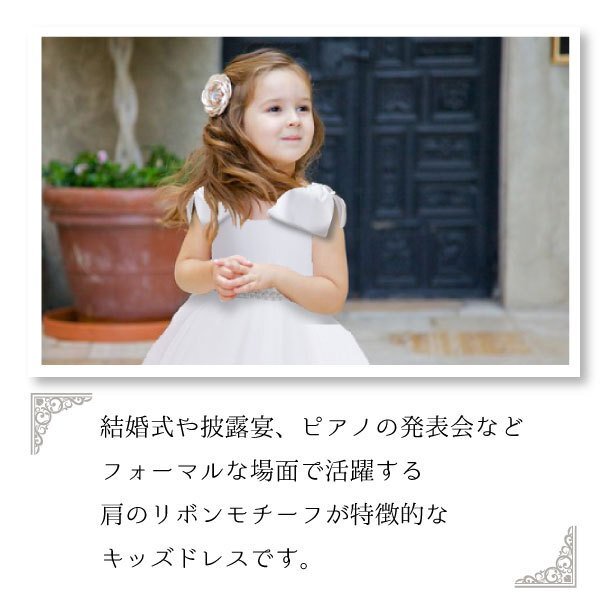 | ☆トリプルリボンドレス キッズ用 ※ご購入されましたらオーダーフォームにご希望のカラーとサイズをご入力ください。 【カラー】 リボンホワイト、リボンローズ、リボンブルー 【サイズ】 110cm、120cm、130cm ※リボンブルー130cmは在庫切れになります。 -*-*-*-*-*-*-*- 【商品名】 トリプルリボンドレス 【素材】 ポリエステル 65% ビスコース 35% 【カラー】 ◆リボンホワイト ◆リボンローズ ◆リボンブルー 【サイズ】 ■110cm ■120cm ■130cm 【おすすめポイント♪】 ■ピアノの発表会などの、結婚式などのフォーマルなシーンで注目を浴びるかわいいドレスです。 ■肩と腰に大きなリボンが付いていてチャーミング♪ ■スカートの透け感も可愛く、フォーマル感がありながらも子供らしい魅力を引き出すデザインです。 ■別売りのパニエを下に履くとよりボリュームがでて可愛さアップ♪ | ||||