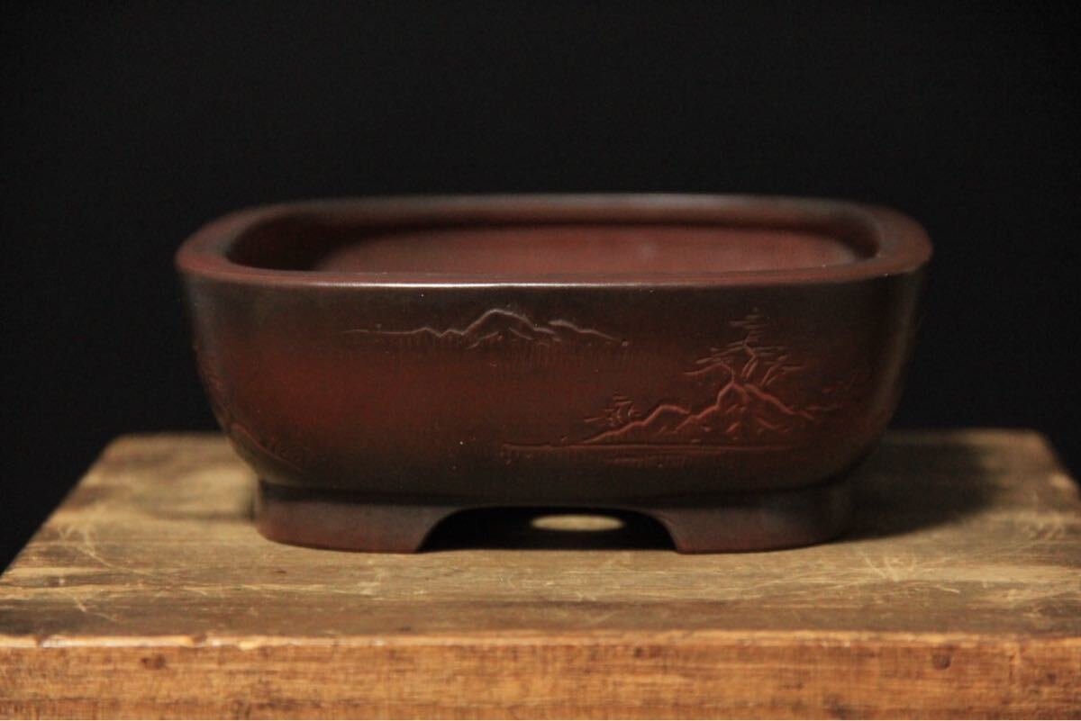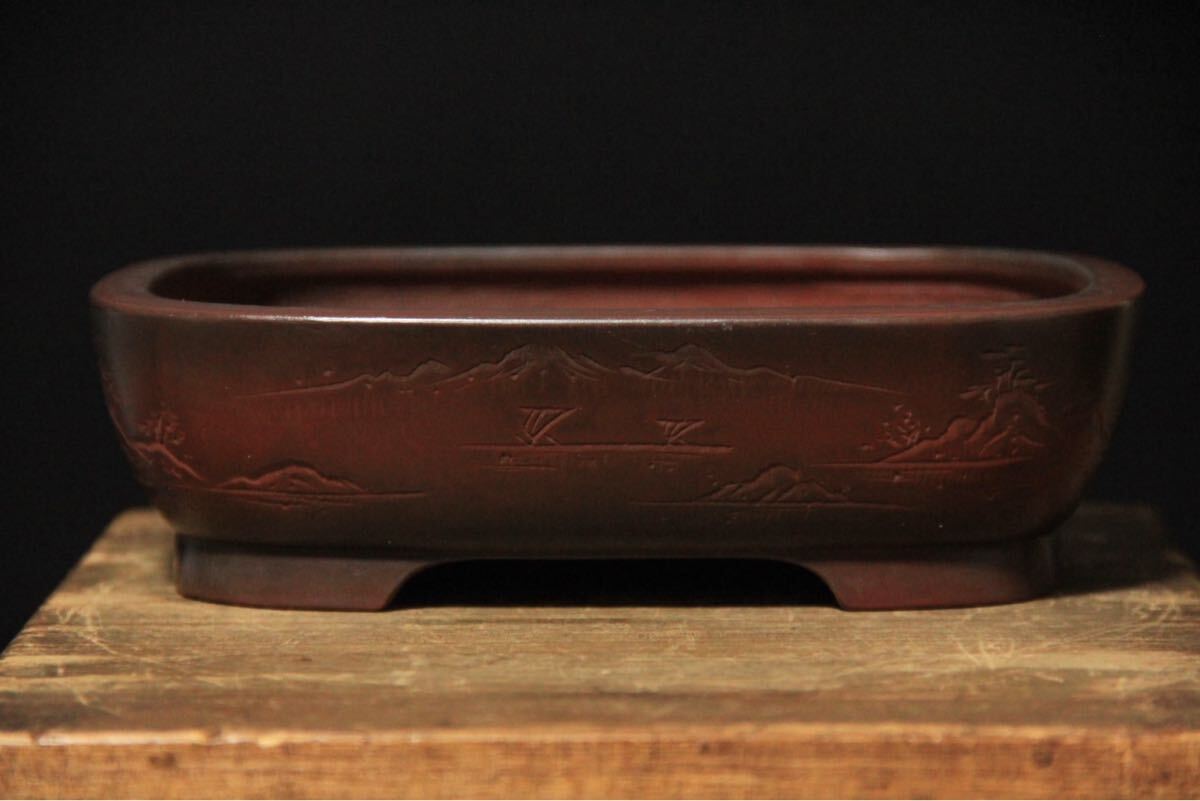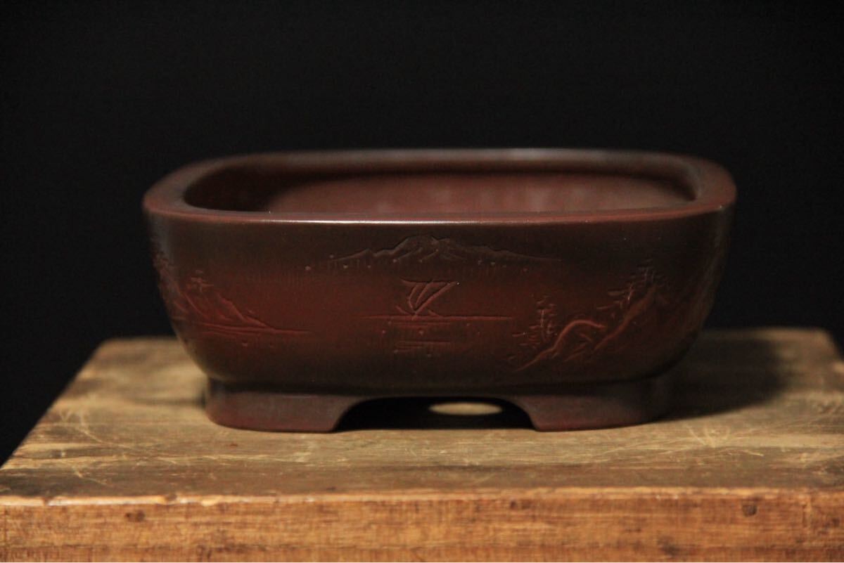美芸朱泥釘彫山水文内縁撫角長方。約19.3×15,1×5.3㎝。