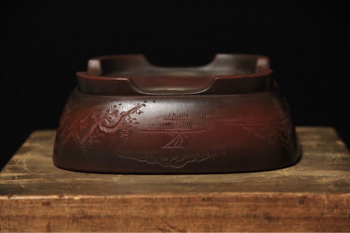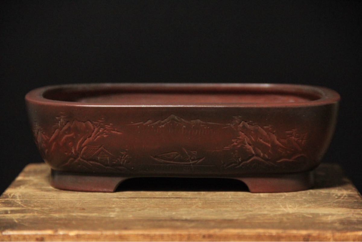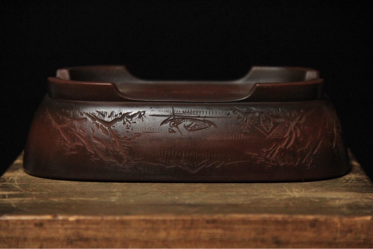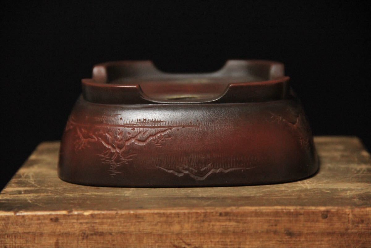 美芸朱泥釘彫山水文内縁撫角長方。約19.3×15,1×5.3㎝。