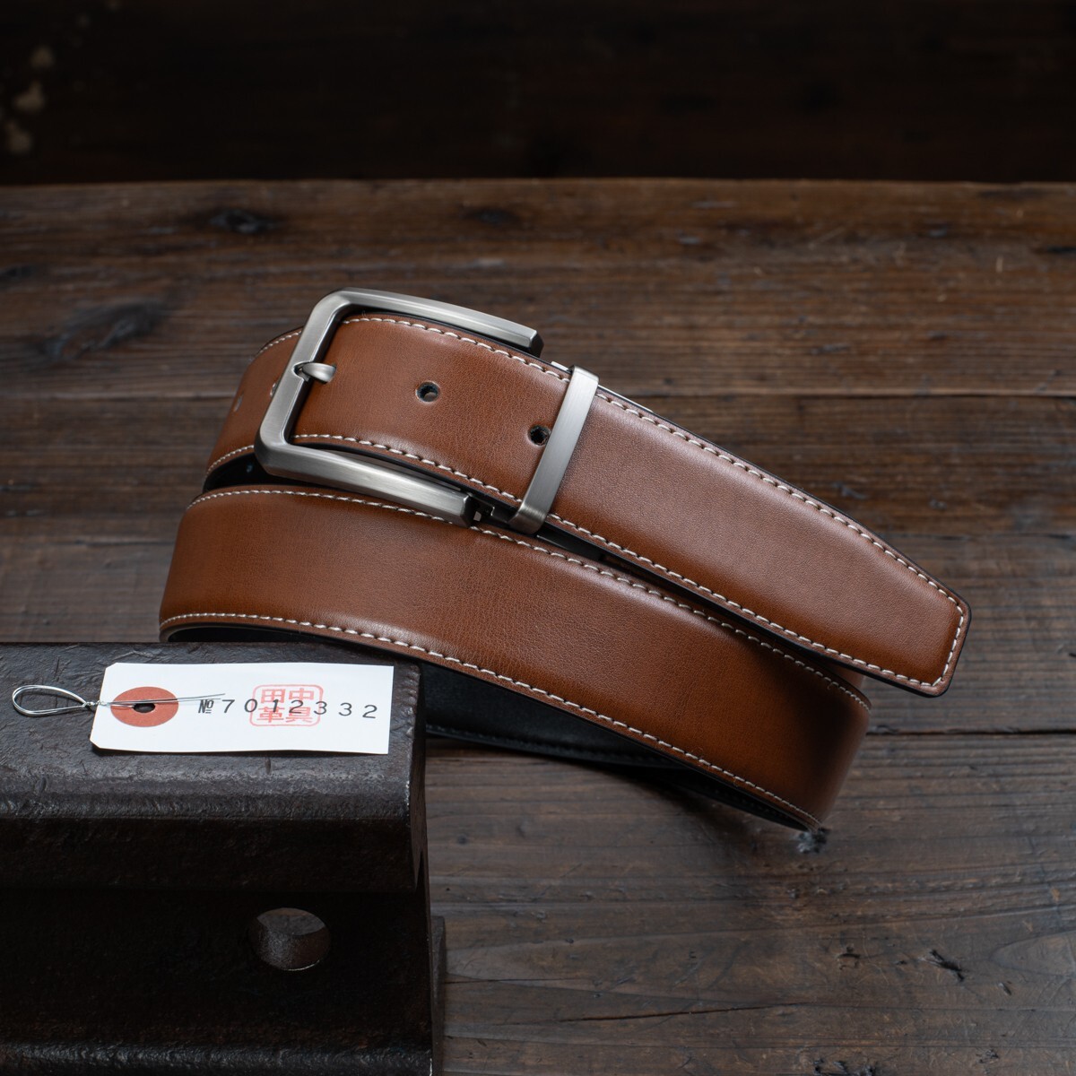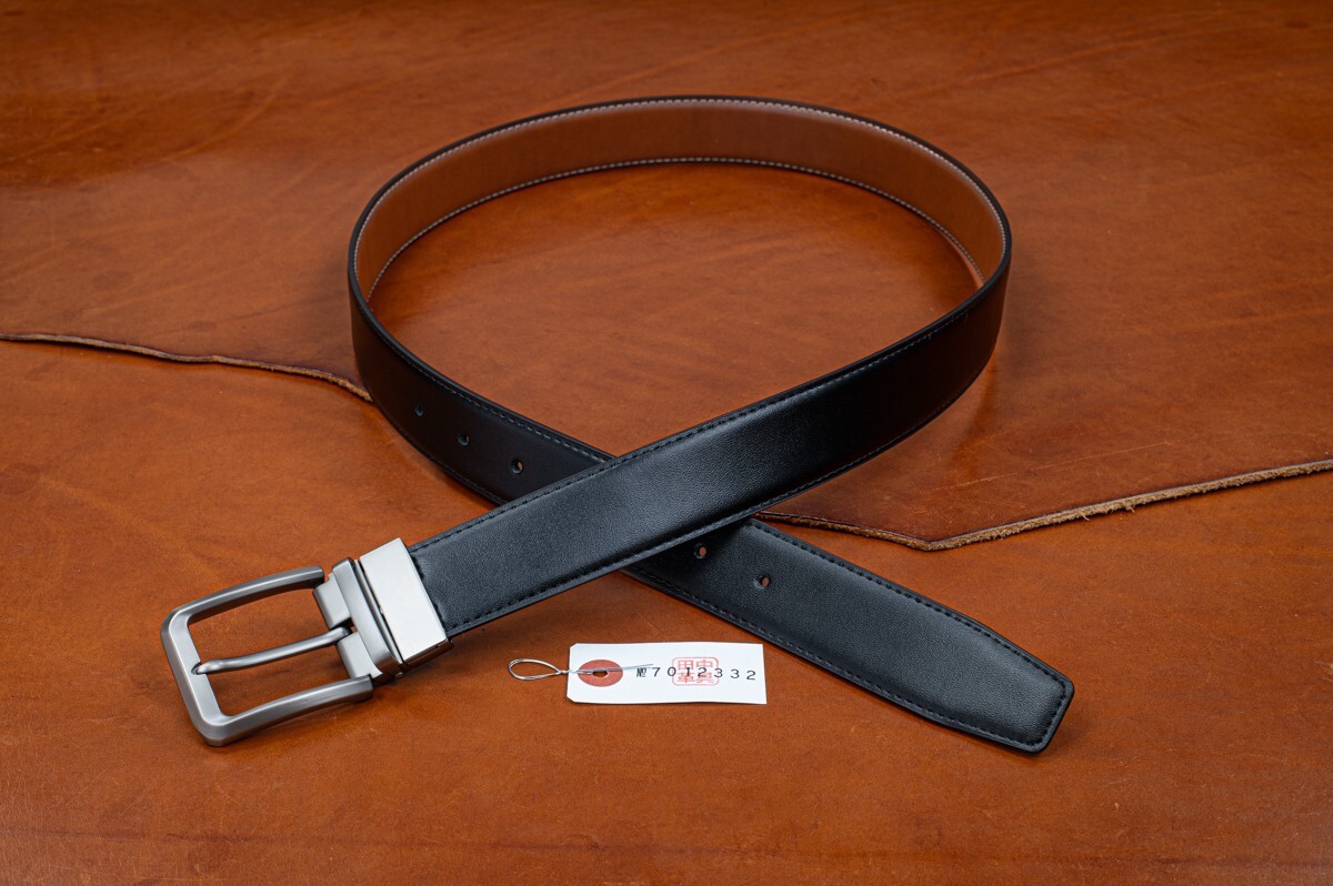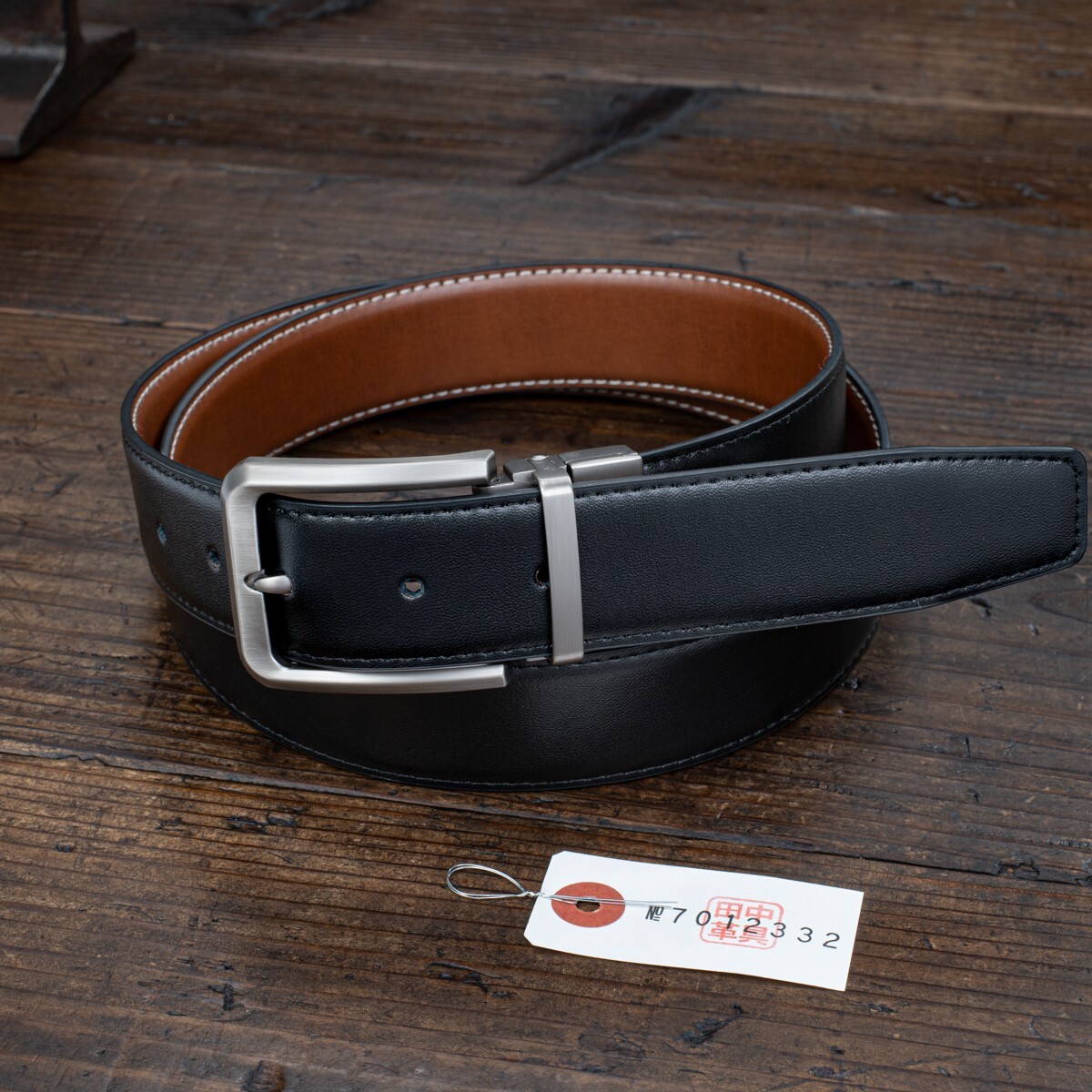 ブラックとブラウンの両面を持つリバーシブルベルトです。ブラックは自然な光沢のある真っ黒で、スーツやフォーマルシーンに合わせやすく、ブラウンは落ち着いた中間色でカジュアルに自然に馴染みます。シーンによって使い分けられるのが大きな魅力です。