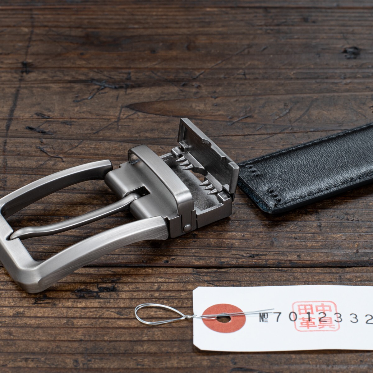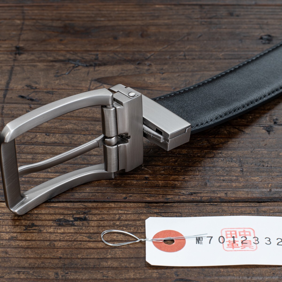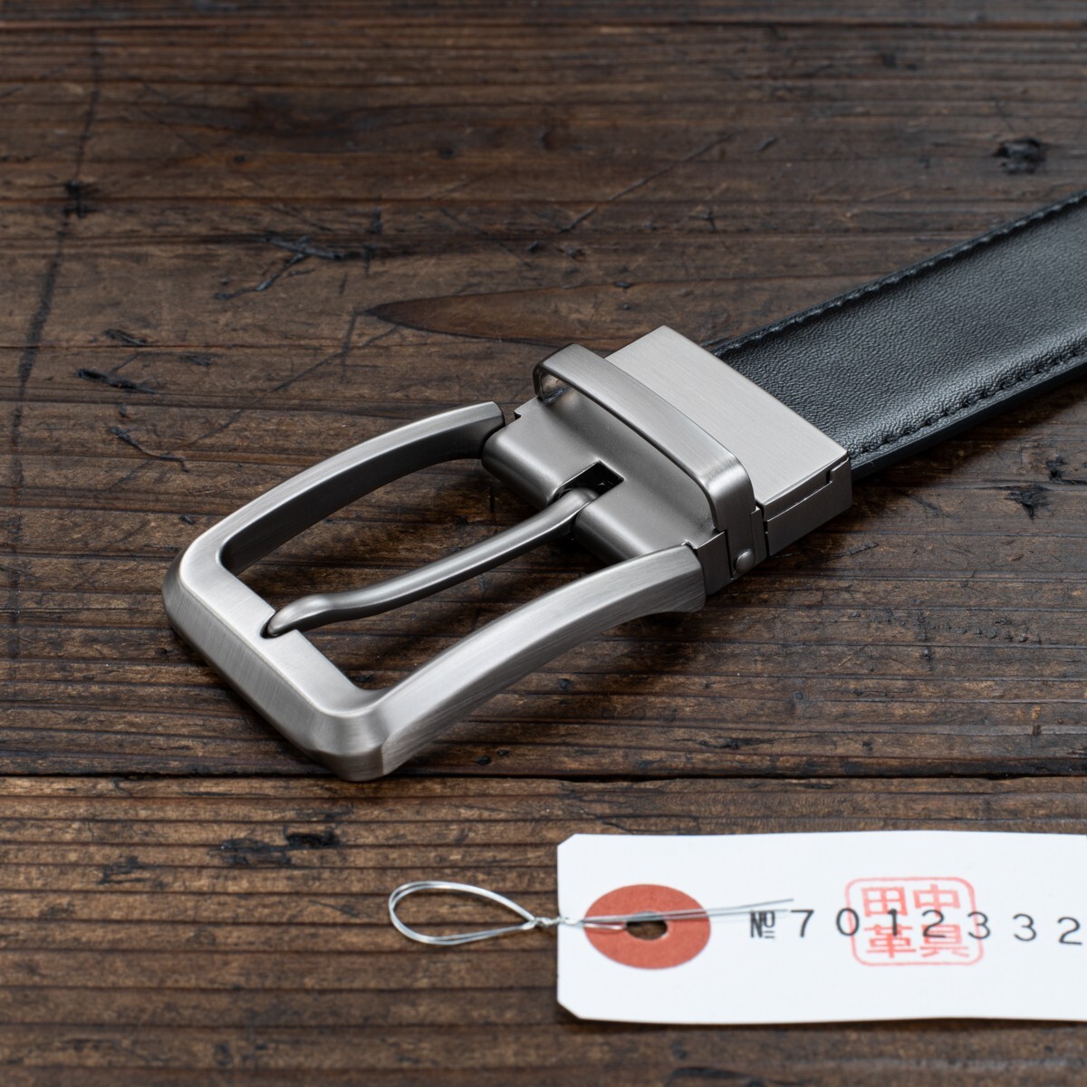 バックルは艶消しのステンレス製でシャープな印象です。シルバートーンの落ち着いた光沢が、ビジネスでもカジュアルでも映える仕上がりになっています。リバーシブルの切り替えは、バックルを軽く引いて回転させるだけで簡単に行えますので、画像も参考にしてください。