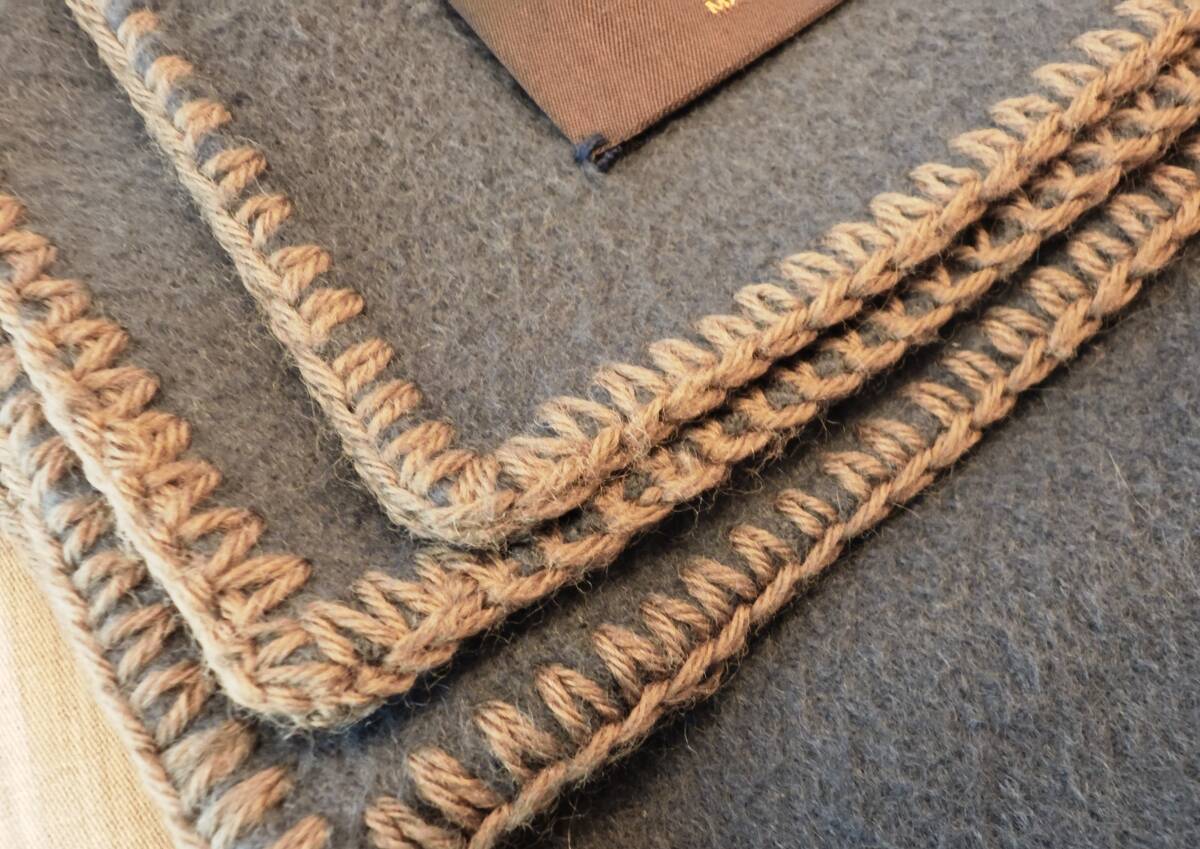 現在ロロピアーナのサイトを見ると、カシミアシルクのブランケットが80万円弱で売られていますが、かなり大判とは言えシルクを混ぜていてもこの値段です。いかにカシミアの値段が高騰しているかということだと思います。また、端の処理は明らかにコストカットがなされています。こちらのブランケットの手のかかり方を写真でご覧になっていただければご理解いただけるかと思います。