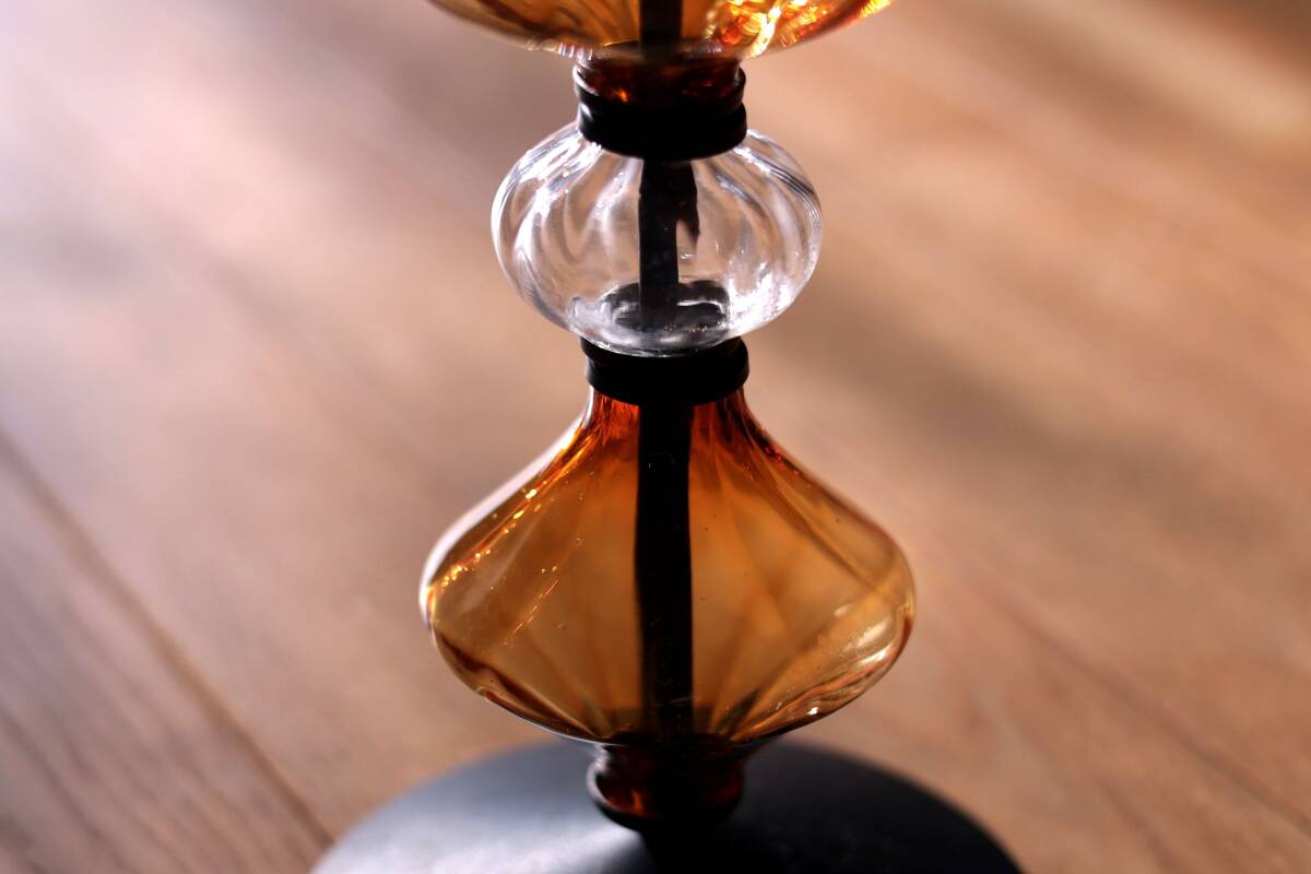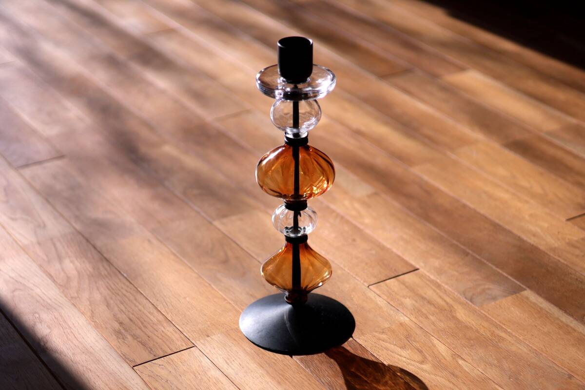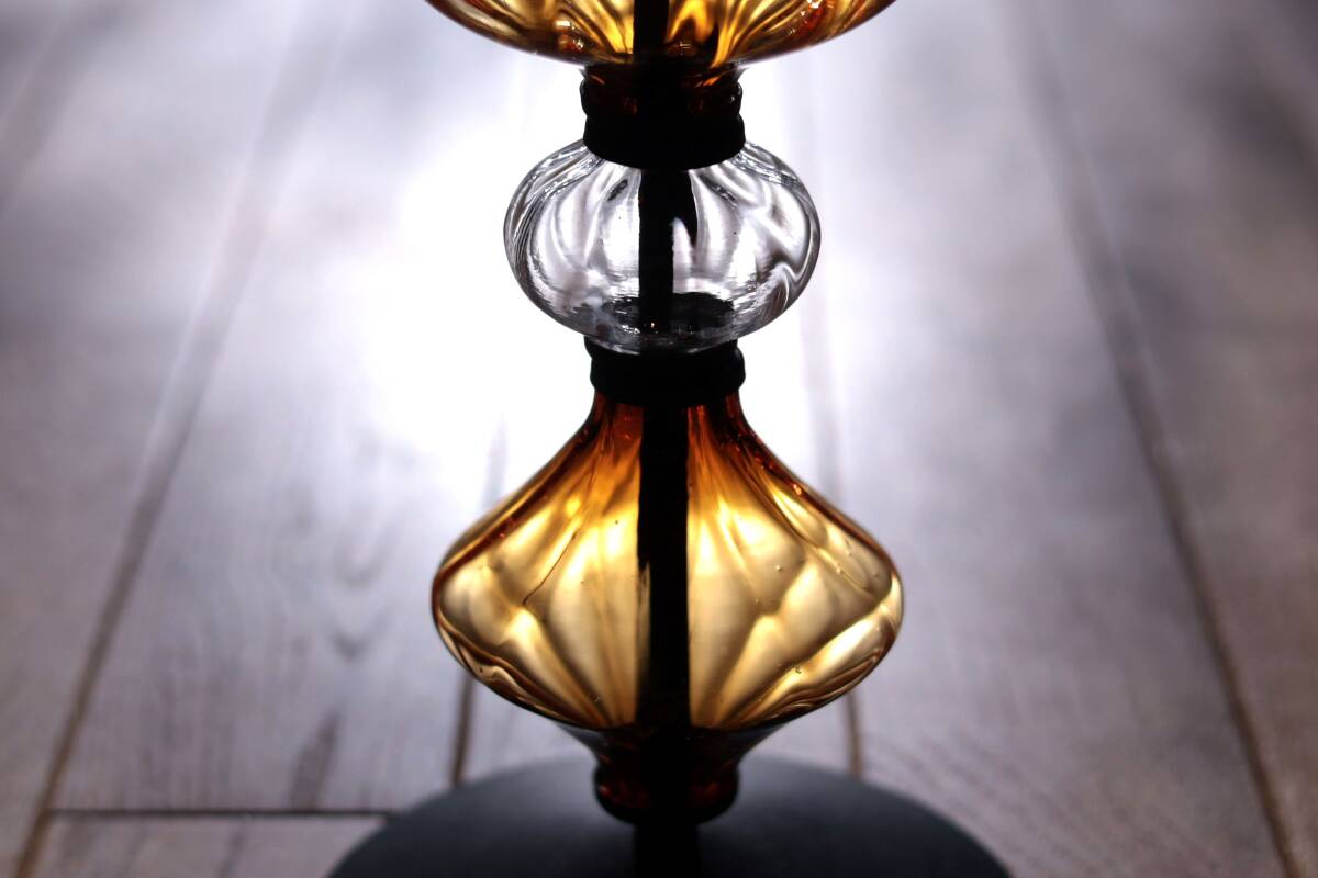| 商品説明 | 品名:Glass Candle Stand キャンドルスタンド デザイン:Erik Hoglund エリック・ホグラン メーカー:Boda ボダ社 製造年代:1950年代-1970年代 カラー:Amber&Clear(アンバー&クリアー) サイズ:Φ13.8cm(土台部分)H36.0cm コンディション:ガラス部分は、製造時及び、経年の擦れや汚れの付着がありますが、キャンドルスタンドは一度解体して、ガラスは出来るだけ綺麗に洗浄していますので、汚れの付着はあまりなく綺麗です。アイアン部分は、経年の擦れや錆はありますが綺麗な状態です。全体としましては、とても良いコンディションです。*ガラス制作上特有の歪み、しわ、くぼみ、気泡の割れ等がある場合があります。また、留め金に接するガラス部には小さなカケや削れなどがありますのでご理解頂ければと思います。 アンバーとクリアのそれぞれ形が違うガラスの連なりがとても美しいキャンドルスタンド。約36cmの高さで存在感があります。底部にBODA社の刻印が入っています(画像7)。 |