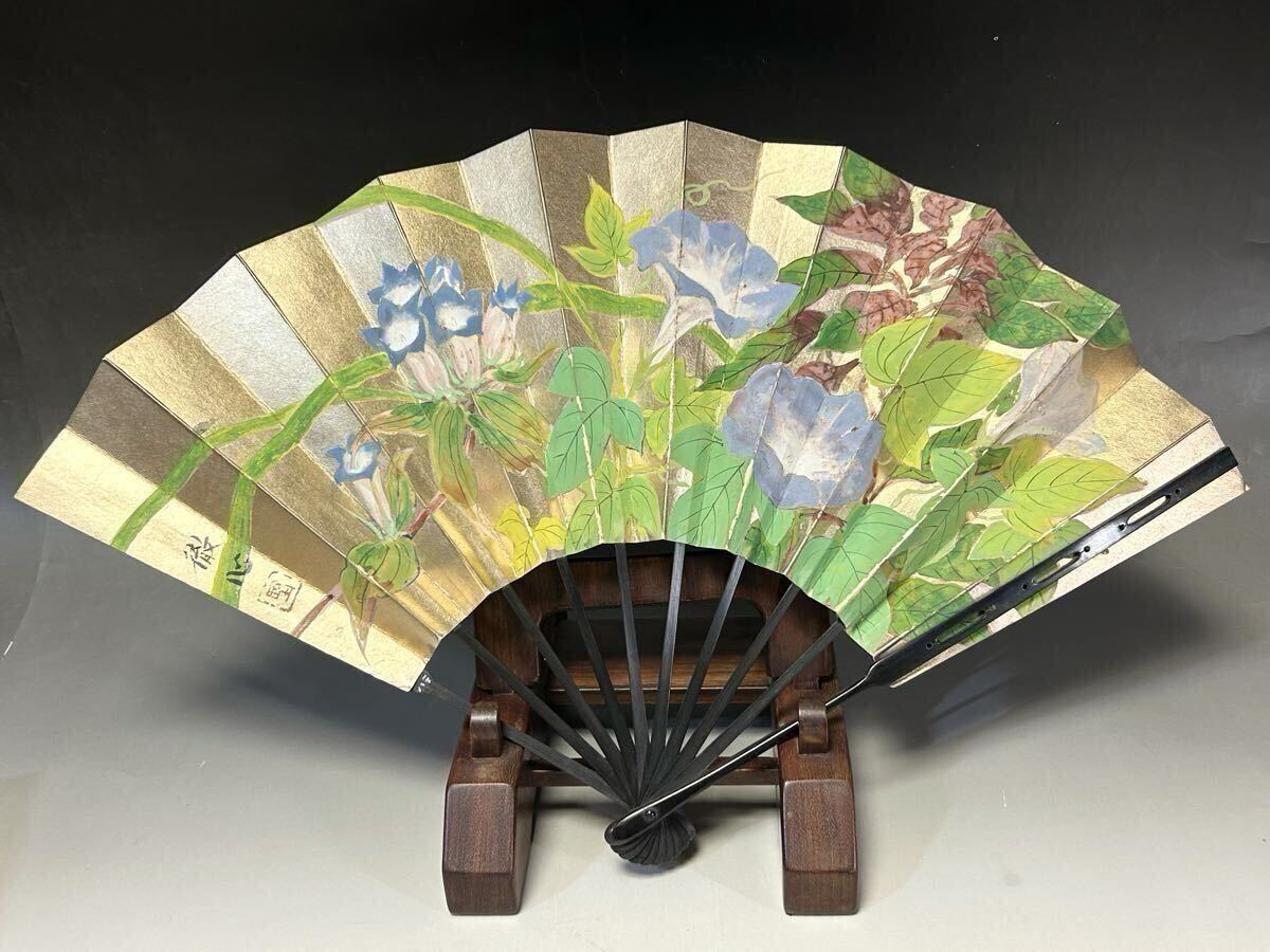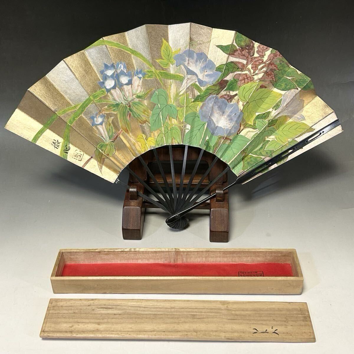 京都 十松屋福井 扇舗 御舞扇 朝顔 リンドウ 桔梗 約33cm 銘あり 木箱