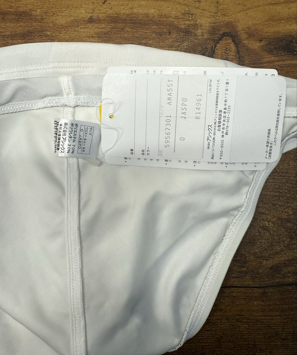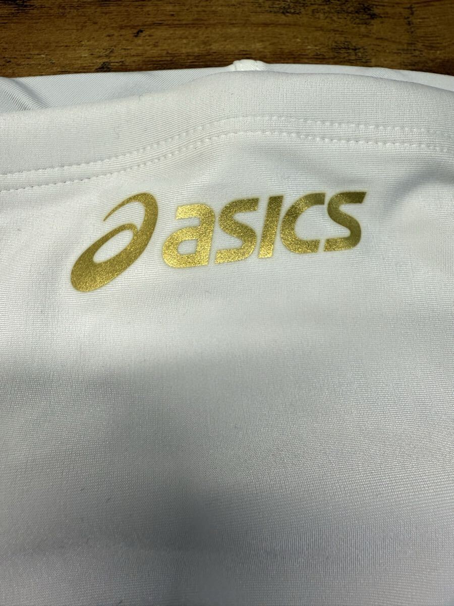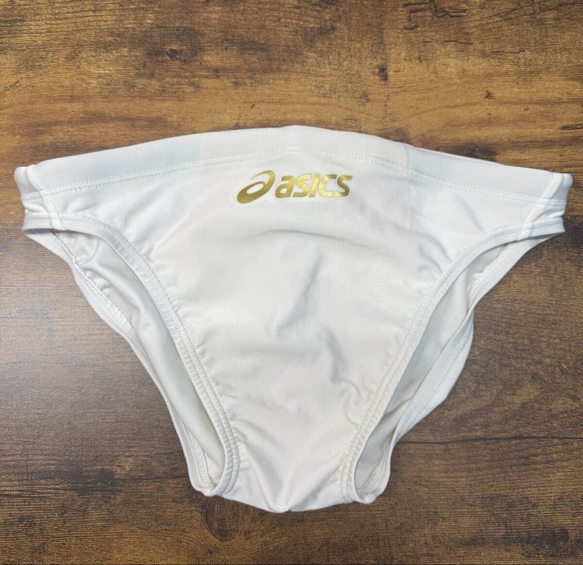 ASICS ハイドロCDの競泳水着です。サイズはOで、色はホワイトです。ロゴの色はゴールドです。ロゴは今のところ剥がれていません。