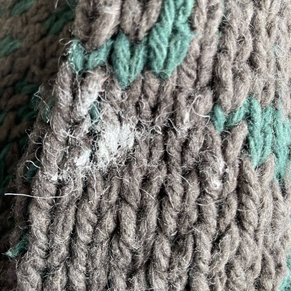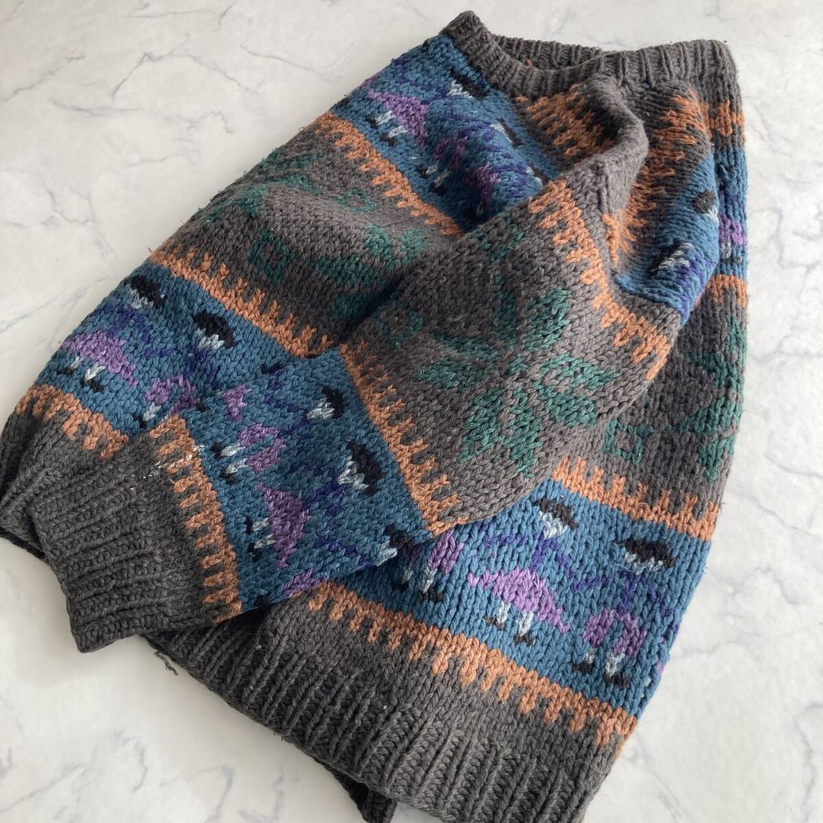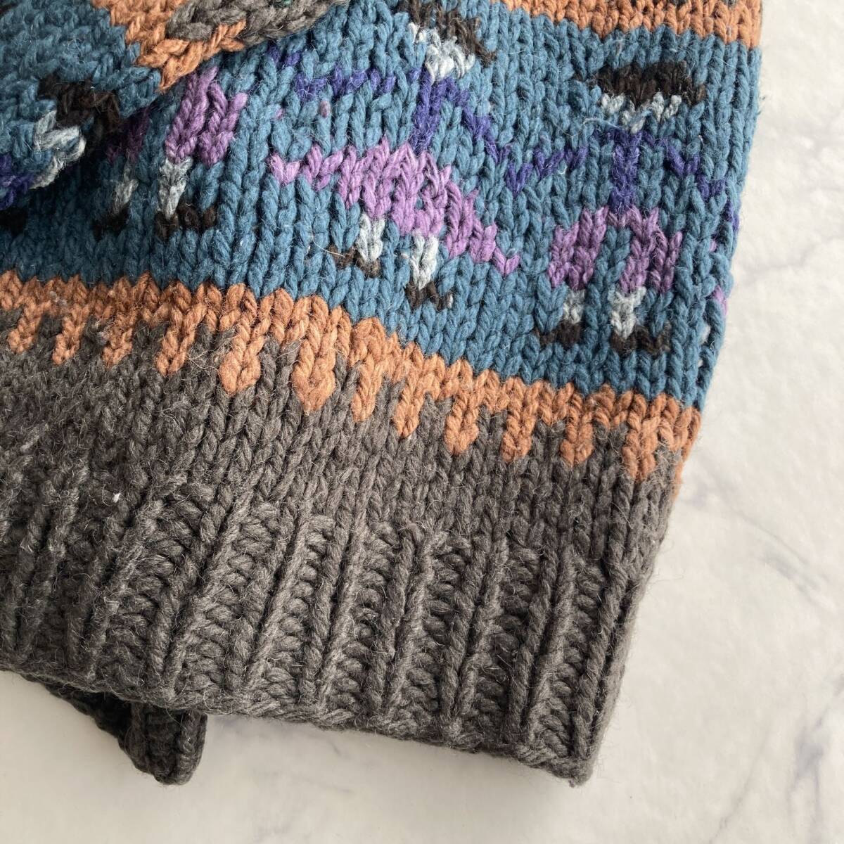 濃いグレーをベースに、ブルー・パープル・オレンジなど彩度を抑えた色味が絶妙に混ざり合い、どこかノスタルジックで、完全に“唯一無二”の佇まい。厚みのあるラムウール糸で編まれているため、見た目以上にしっかり暖かく、冬場のアウター代わりにもなるほどのボリューム感です。