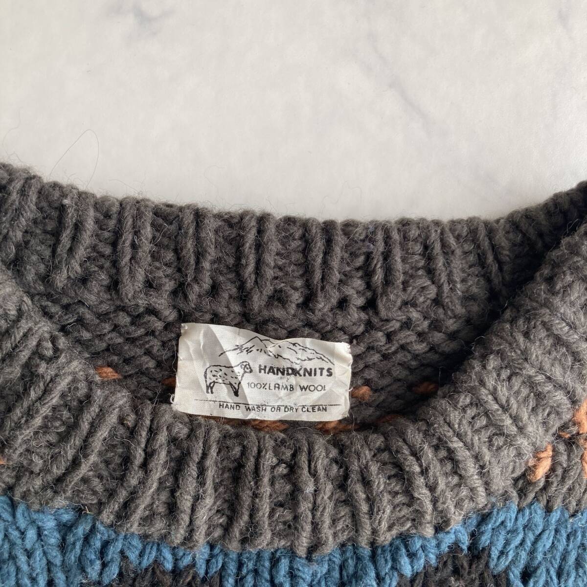 手編みならではの“揺らぎ”と“味”がしっかりと生きた、希少なハンドメイドニット。丁寧に編み込まれた図案は、古い民芸調のような独特の温かみがあり、既製品では決して出せない素朴で力強い表情を宿しています。