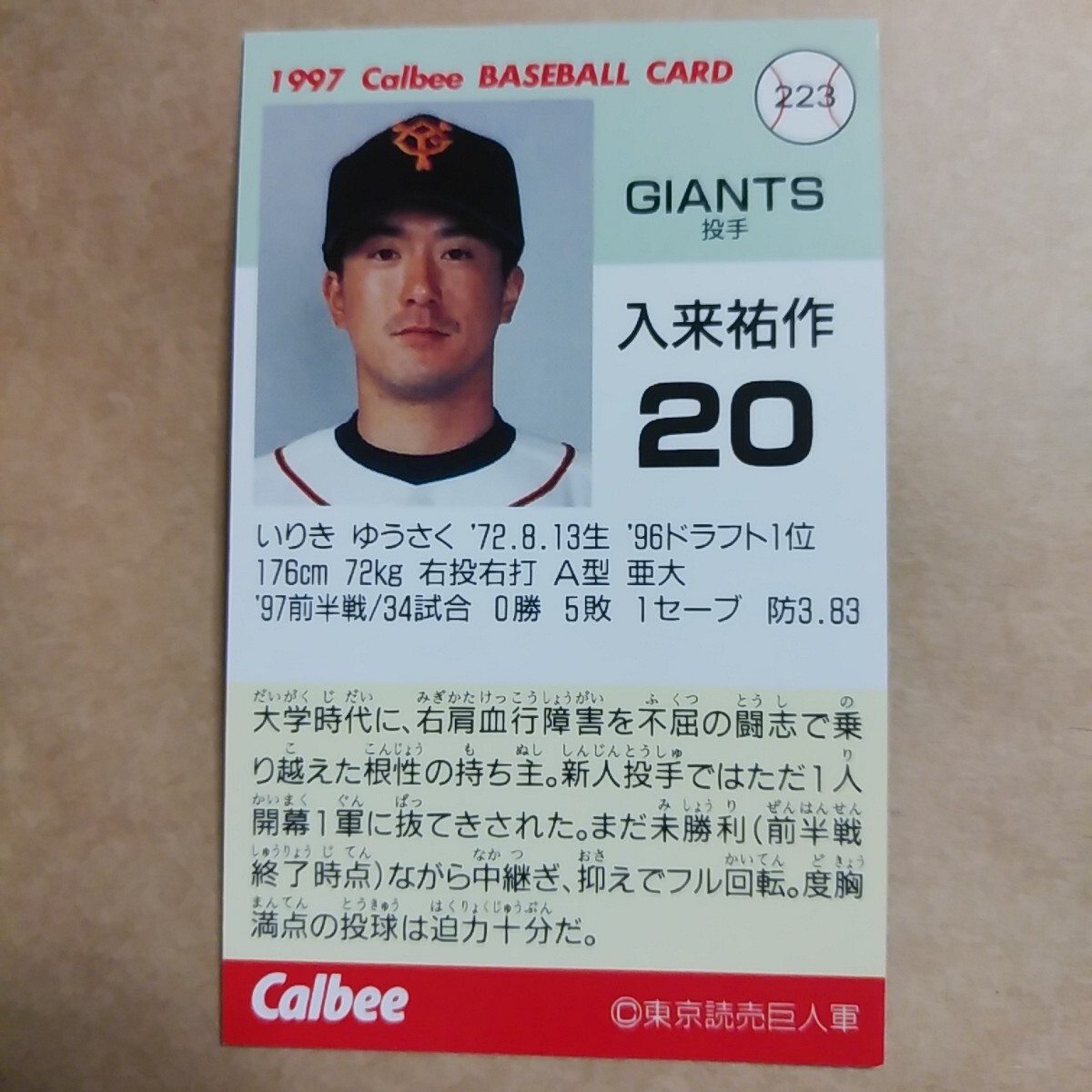 レアブロック1997カルビー野球カード№223入来祐作(巨人)ハイナンバー