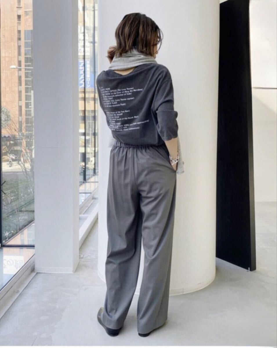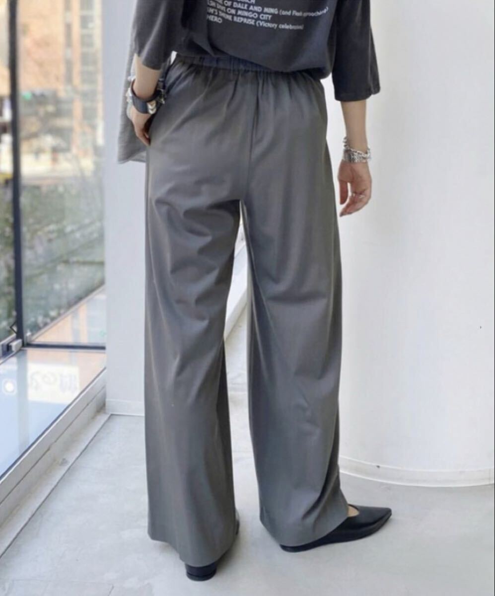 ゆったりとしたワイドシルエットが、こなれ感を演出。繊細でコンパクト、柔らかな肌触りで軽い着心地の生地感に加えて、ウエストがゴム仕様なのもリラックスして穿いてもらえるポイント。