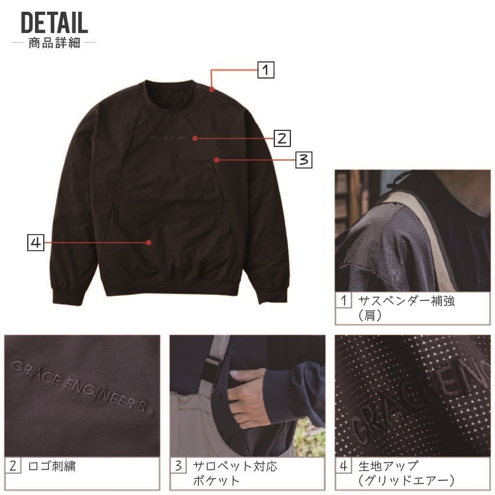 ポケットは胸当て部分を意識し、肩にはサスペンダー補強布もあるサロペット好きのためのクルーネック
