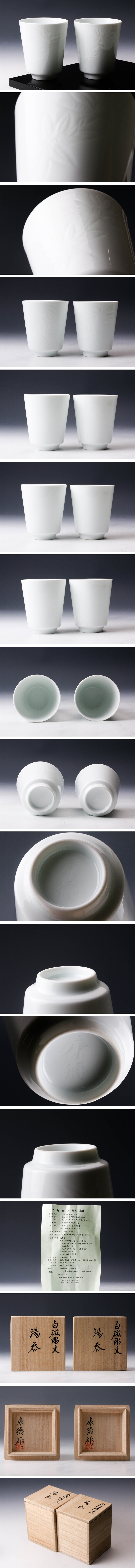 【佳香】井上康徳 白磁彫文湯呑 二客 共箱 栞 本物保証