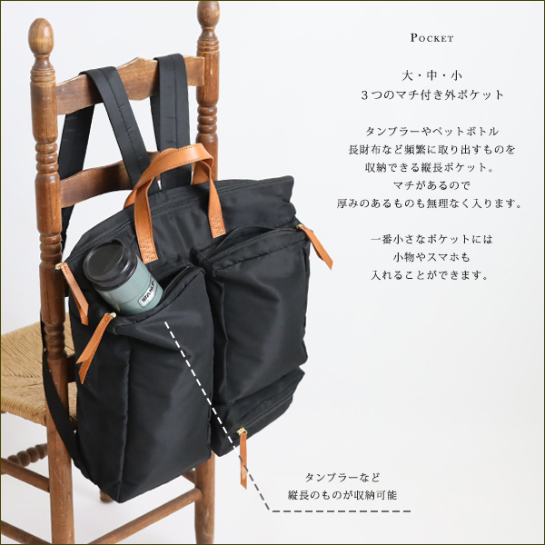 タンブラーやペットボトルの入る【縦長ポケット】や、