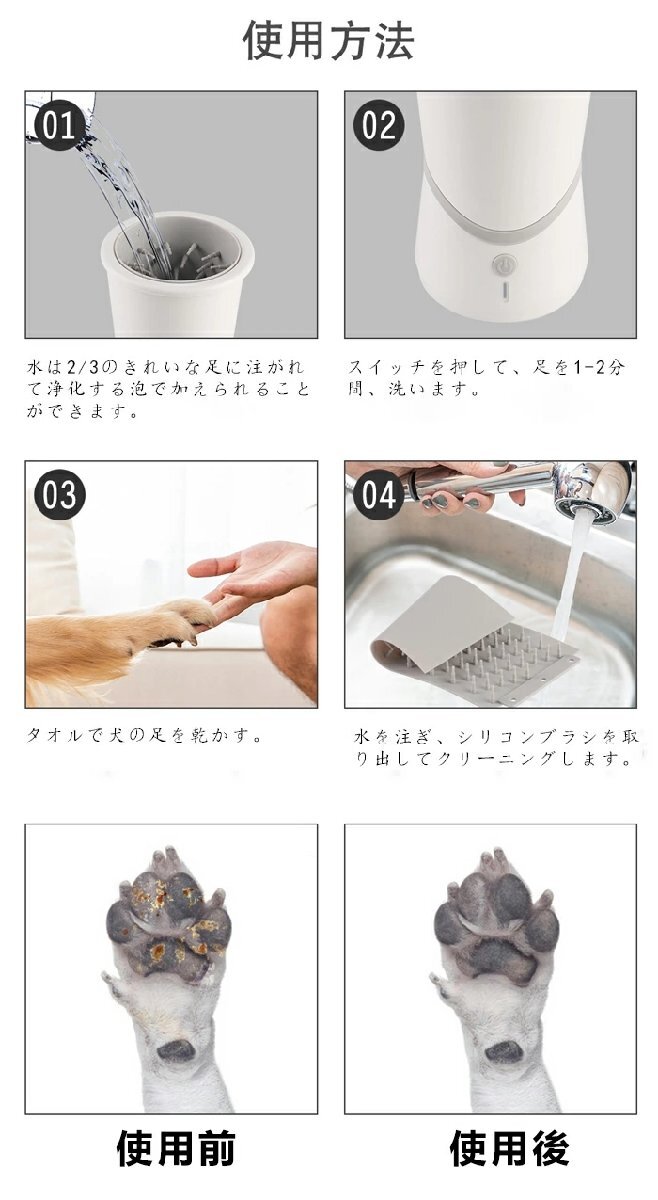 【全自動・ボタン押すだけ】他社の手動や半自動製品よりもっと時間と力を節約します。カップに半分ぐらいの水と清潔剤を入れると、ペットの足をカップに入れてからスイッチを押すだけ、本体はすぐ回転します。約1分だけ清潔が完了して、ペットの足はすぐに綺麗になり、衛生です!操作が簡単で携帯も便利です。ご愛犬と散歩しましょう!