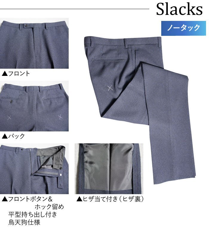 | スラックス | ノータック 股上浅め ボタン&ホック留め 平型持ち出し付き 烏天狗仕様 ヒザ当て付き |