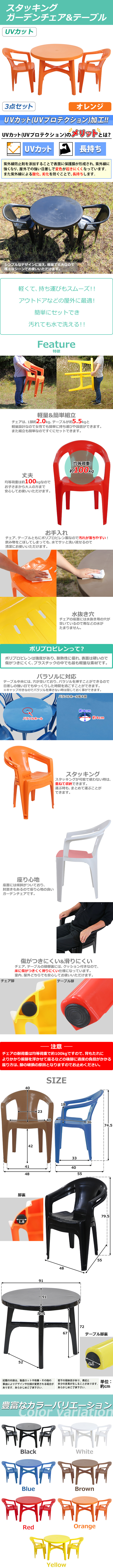 ●UVカット加工によって屋外での強い日差しで変色しにくくなっています。 ●紫外線による酸化、劣化を防ぐことにより、長持ちする作りになっています。 ●ガーデンチェアは、スタッキング構造なので重ねる事が可能なので、収納やまとめて運ぶ際にも大変便利です。 ●テーブル中央にパラソルなど、設置可能な穴があります。 ●テーブルは、簡単な組み立て式になります。チェアは、完成品です。 ●チェアは1脚約2kg、テーブルは約5.5kgと軽量なので、女性でも軽々持ち運べます。 ●材質は、軽量、安全、防水のポリプロピレン(PP)です。 注意! 背もたれによりかかり前脚を浮かせて座るなどの後脚に過度の負担がかかる座り方は脚の破損の原因となりますのでお止めください。 ■重量(チェア):約2kg(1脚あたり) ■耐荷重(チェア):約100kg(1脚あたり) ■重量(テーブル):約5.5kg ■耐荷重(テーブル):約100kg ■材質:PP[ポリプロピレン](チェア、テーブル)、ゴム(チェア脚裏)、PVC(テーブル脚裏) ●商品のカラーはオレンジとなります。 ●新品商品ではありますが、輸入商品の為、多少の擦り傷などがある場合がございますので、ご納得の上ご購入下さいませ。 ●ご購入後、お客様ご都合によるご返品、ご返金等は一切お受け致しておりません。 ●本商品を使用した際に発生したトラブル、事故につきまして、当社は一切の責任を負いません。ご使用に関しましては、全て自己責任にてお願い致します。 |