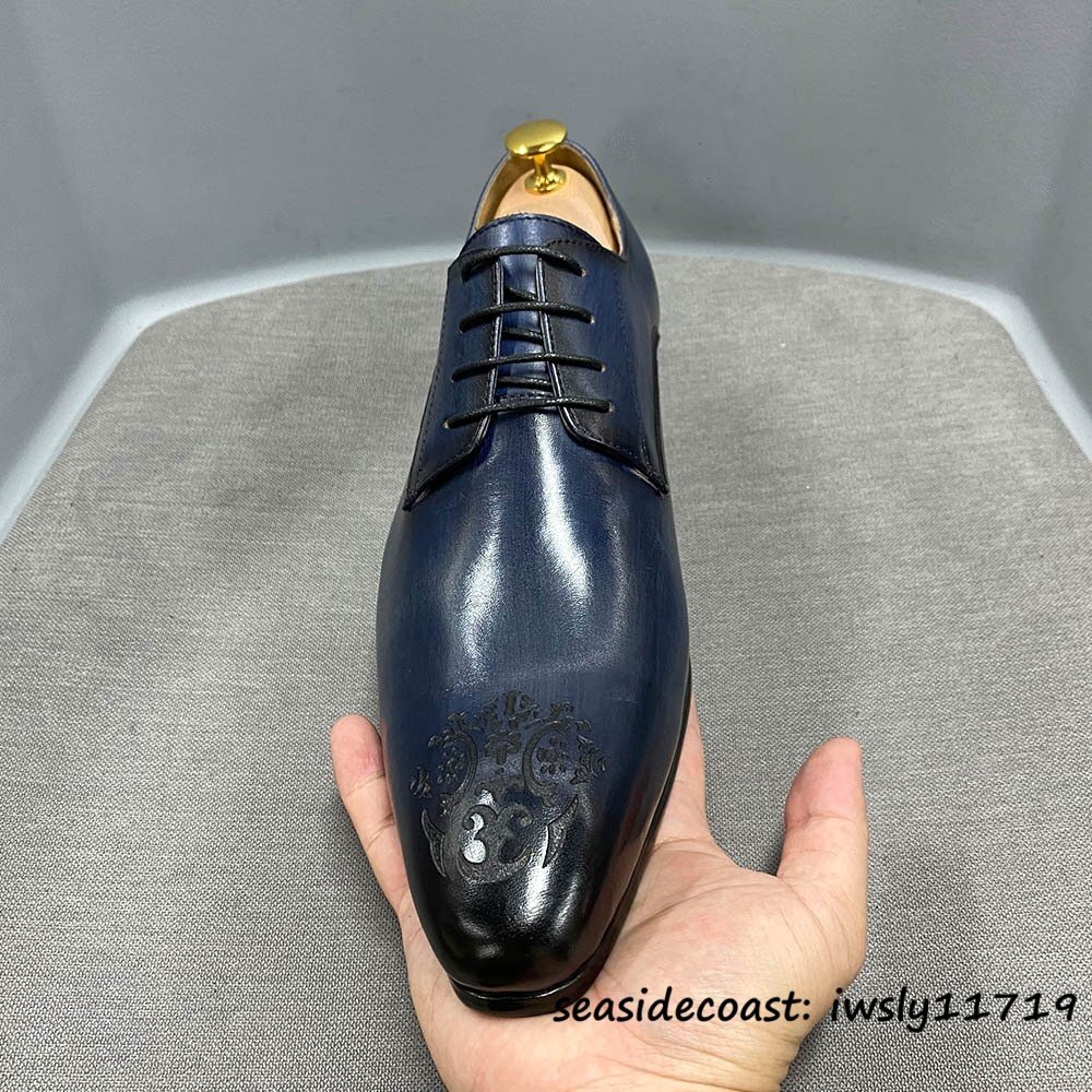 定価9万超★メンズ ダービーシューズ 本革 レザーシューズ 職人手塗り上げ ビジネスシューズ 牛革 紳士靴 革靴 フォーマル ブルー 24.5cm