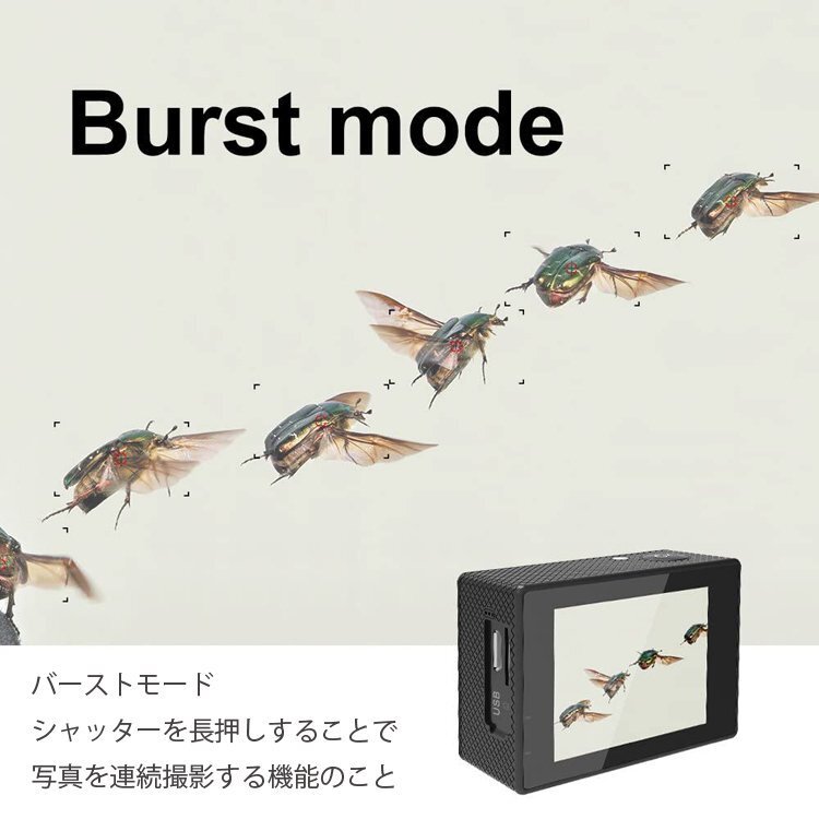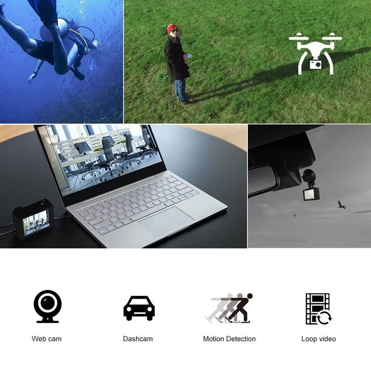 モード:VideoLapse、PhotoLapse、バーストモード、カーモード、水中モード、TVモード設定とオプション:WDR、モーション検出、TV出力、OSDモード、オートパワーオフ、調整可能なFOV、ループ録画、画像回転、ISO、EV、カラー、ホワイトバランス、シャープネス言語:English /Francais/ Deutsch /Espanol/ Italiano / Portugues /