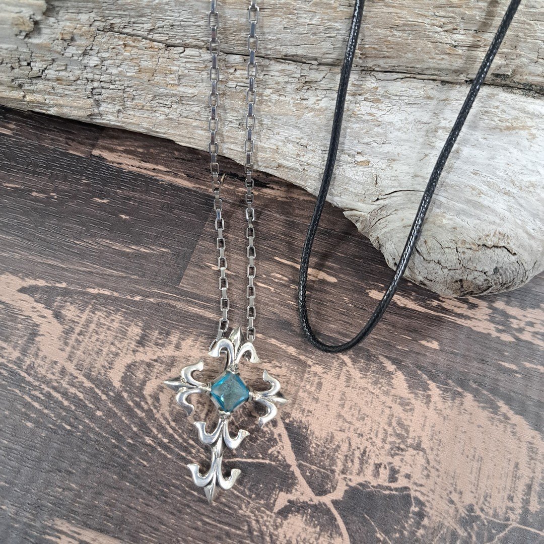 【C7012】送料無料 シルバー925 チャーム アラベスククロス水色 ジルコニア ライトブルー ネックレス ペンダント アクセサリー ゴシック メンズ レディース チェーン スクウェア 60cm
