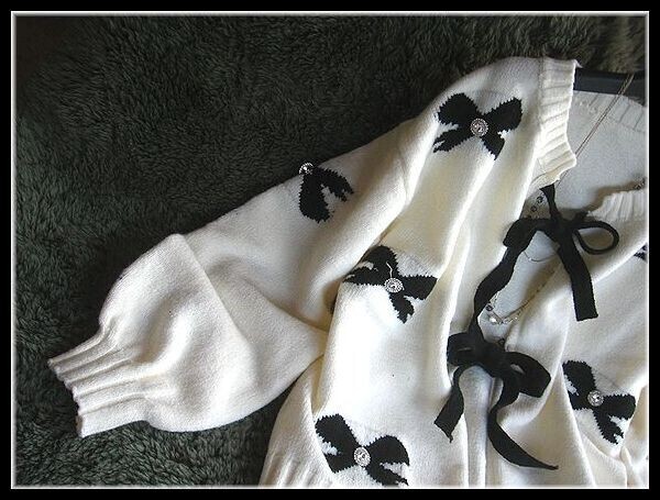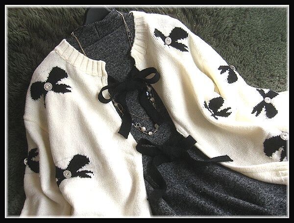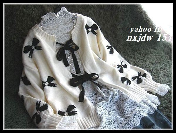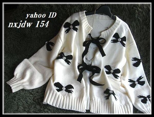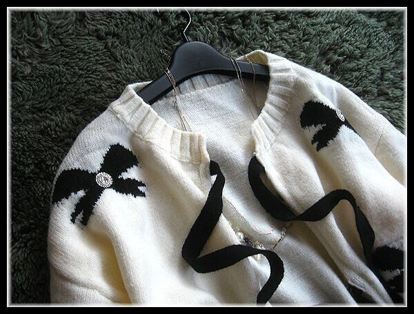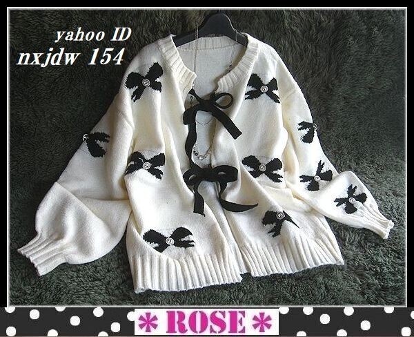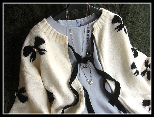 ◆Rose◇ ゆったりワンサイズ・大人フェミニン♪編み込みリボンが可愛いカーデジャケット/黒×アイボリー