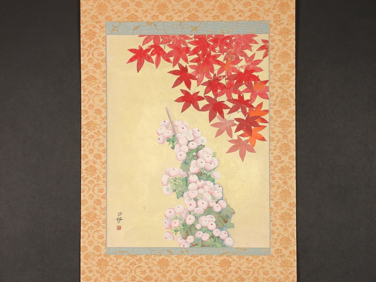 【模写】【伝来】am5384〈森田沙伊〉紅葉に豆菊図 共箱 二重箱 太巻 金地 春芳堂表具 日本芸術院会員 北海道の人