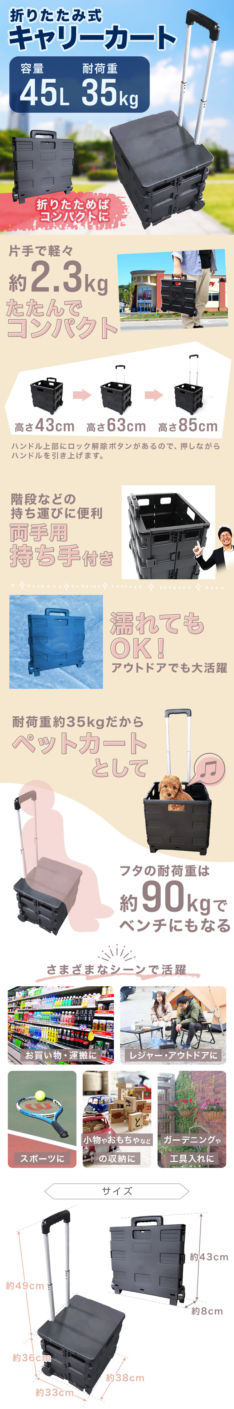 アウトドアのお供に! 折りたたみキャリーカートです。 重さは35kgまで対応。 折りたたむと厚さ8cmでコンパクト! キャリーカートはいろいろ使える!! ・アウトドア時の荷物の持ち運び ・スーパーなど、お買い物時の荷物の持ち運び ・ビジネス時に必要なアイテムの持ち運び ・スポーツ用品の収納 持ち運び ・ガーデニング用具や工具などの収納 持ち運び サッと広げて使えるこのカートなら大きなキャスターが付いているので移動がラクラクです♪ 取っ手もスルっと伸ばせます。 今までは体力が必要だった荷物の運搬をスムーズに行っていただくことができます!! 【商品仕様】 カラー:ブラック サイズ(約): ・使用時:幅38×奥行き33×高さ43~85cm ・使用時内寸:幅33×奥行き29×高さ30cm ・収納時:幅38×奥行き8×高さ43cm 材 質:ポリプロピレン樹脂 重量(約):2.3kg 耐荷重:35kg |