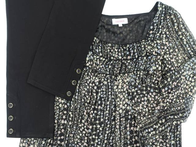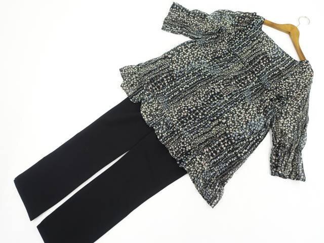 洗える七分袖シフォンチュニック+ストレートパンツ コーディネート上下2点セット L相当 ブラック地 ブルー×イエロー×ピンク 花柄/ブラック シンプル・カジュアル系 20代・30代~