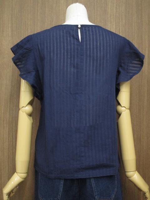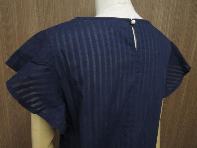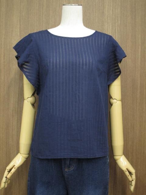 フリルスリーブ 半袖 ラウンドネック プルオーバーブラウス 38 ネイビー ストライプ柄 【メール便可】