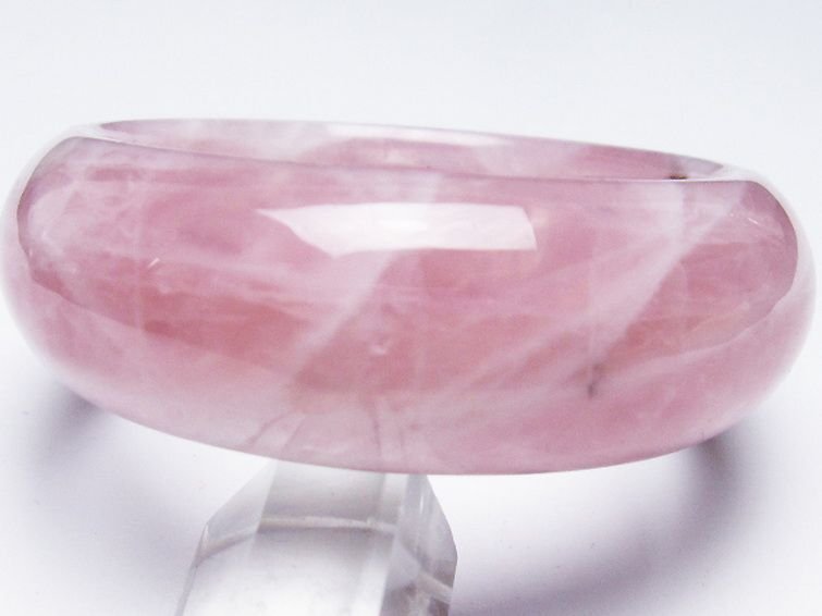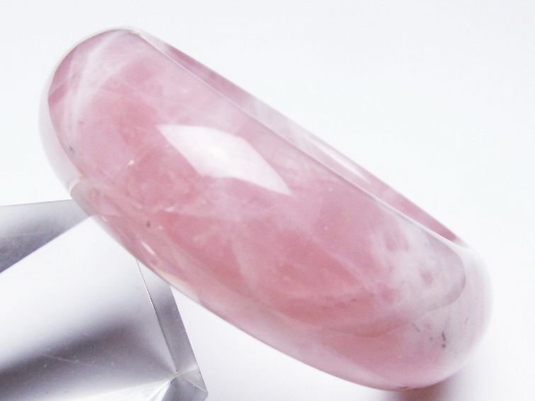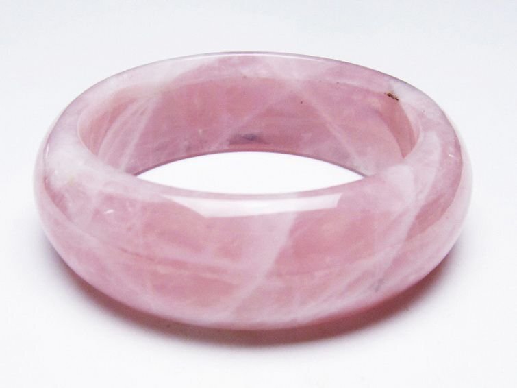 | ■商品名: ローズクォーツバングル ■商品ID: T492-3670 ■商品重量:約 80.8g ■商品サイズ:内径約:55mm 外径約:73mm 【ローズクォーツ(紅石英)】 ローズクォーツは柔らかい優しいピンクの水晶です。アルミニウムや酸化チタンなどの結晶を含むためにピンク色になると考えられています。これらの微細な結晶が分散しているため、石全体の透明度が低く、濁っていたりひびがあります。高品質の透き通ったものや、スター効果が確認できるものは珍重されています。 この石は愛や優しさ、内面美を象徴する石です。ローズクォーツと言うと「恋愛運アップ!」といったイメージが一般的ではないでしょうか。 ローズクォーツは持ち主の内面の美を高め、女性の幸せや喜び、愛を呼び起こしてくれるとされています。また過去の傷ついた経験から、ついネガティブ思考になったり自分に対してマイナス思考になったりするような、負の感情を優しさで包み込み癒し、自分を許し愛せるようになるそうです。 この石は目当ての異性を連れてくるというよりは、内面的に美しくなり自分を良い意味で大切にする自己愛を知ることにより他者から愛されるという効果のようです。例えば自分なんか大嫌い、自分なんかどうせ、と思っている時に、他人から愛されるでしょうか。それよりも自分を認めて受け入れ、愛していると内面が輝いて魅力が溢れます。その魅力により周囲の人から愛され、他人から愛されることにより一層他人を愛せるようになるという、愛を呼び込む循環を造ってくれるそうです。 そういった意味で、実は恋愛運アップというよりはもっと定義の広い愛情運アップの効果があるとされています。 こういった広い意味での愛を得ることができるとされ、人に対して思いやりを持ち許せるようになることから、人間関係の改善や、苦手だけれどどうしても付き合わなければならない人がいるといった場合でも活躍してくれることでしょう。 【水晶(石英、クリスタルクォーツ)】 水晶とは石英を指しますが、一般的に無色透明のものをクリアクォーツやロッククリスタルと呼んでいます。 水のように美しく透き通ったものが良いと思われがちですが、内部にヒビや他の鉱物などのインクルージョン(内包物)が入っているものがあり、それが天然物の証。また、インクルージョンによって様々な種類に分類され、それぞれ違った印象を与えてくれます。 古くから呪い事に使われてきた水晶に秘められたパワーはとても万能で、あらゆる場面に対応するといわれています。特に邪気を祓う力が強いため、人間関係を円滑にしたり、心身をクリアな状態にしたい場合に最適です。また空間を浄化する作用もあるとされ、インテリアとしても高い人気を誇っています。 石自体に強い自浄作用があり、他のパワーストーンが吸収した負のエネルギーを浄化するといわれています。更にアクセサリーとして他の石と組み合わせる場合、それぞれの石の個性を引き出しバランスを取ってくれる効果があるそうなので、ぜひとも組み込んでおきたいですね。 パワーストーン入門に最適な水晶ですが、愛好家にとってはかなり奥が深く最後に行き着くのもこの石なんだそうです。何もかもを見透かすような透明な水晶には、本当に神秘的なパワーが宿っているのかもしれません。 |