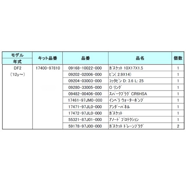 ●適合船外機:DF2 2012年以降モデル用 現行モデル対応品 ●内容品:画像データを参照願います ★スズキ船外機の日常点検や経年劣化による交換パーツ類の一式キットになります いざ必要となった際に準備するのではなくストックとしてお持ちいただくことで、トラブル等の際にその場で対応が可能となります 船外機とご一緒にご購入いただくこともオススメいたします | ||||