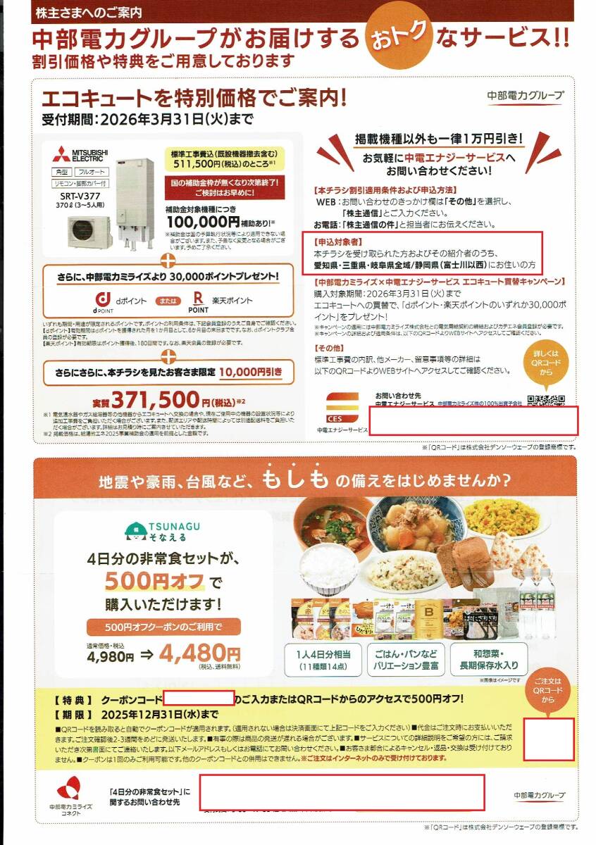 中部電力株主優待エコキュート割引など 東海近隣対象 2026.3.31