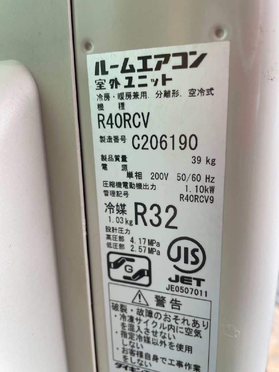ダイキン R40RCV エアコン 室外機のみの出品となります。状態は長期倉庫に保管された為、梱包の痛みあります。写真以外にも本体に凹みや傷が有るかもしれません。動作につきましては室内機が有りませんので動作未確認となります。動くかどうかの保証が致しかねますのでノークレーム・ノーリターンでお願いします。超特価の39800円スタートでお願いいたします。落札価格に別途消費税がかかります。発送は佐川急便の送料着払い(保険加入不可)を予定しております。システム上送料0円と表示されてしまいますが、送料着払い運賃のご負担となりますのでご了承ください。エアコンの室内機のみ、室外機のみの商品はほかの販路でも販売させていただいておりますので、ご希望の場合はなるべく早くご入札をお願いします。入札がない場合は取り消しをすることがございますのでご注意ください。ほかにも多数出品しておりますのでよろしくお願いいたします。