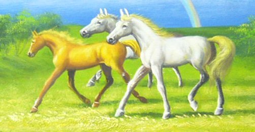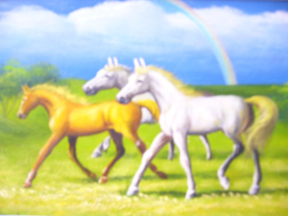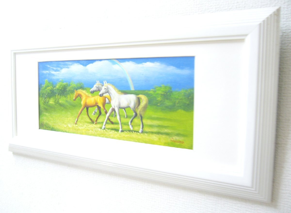 | 作品説明 | 雨上がりの虹の中、前へと進む、馬は何事も全て上手く好くと言う縁起物。行く手に良い事が待っている絵画・油絵です。 |