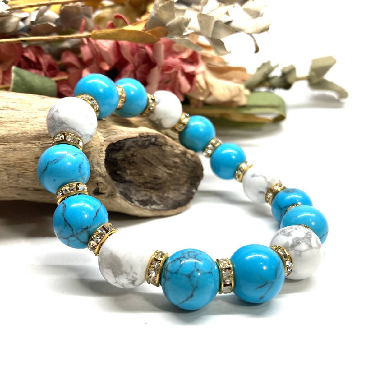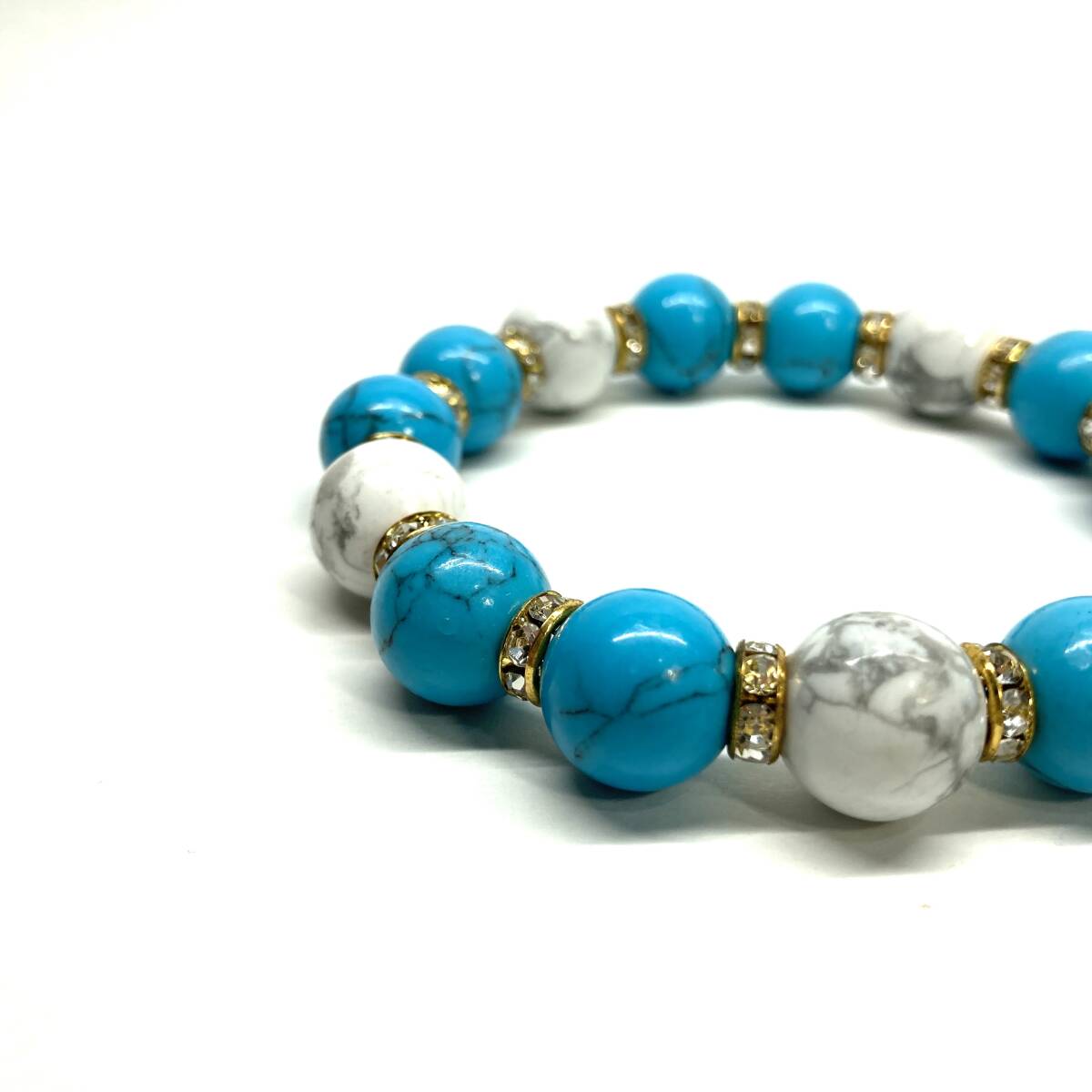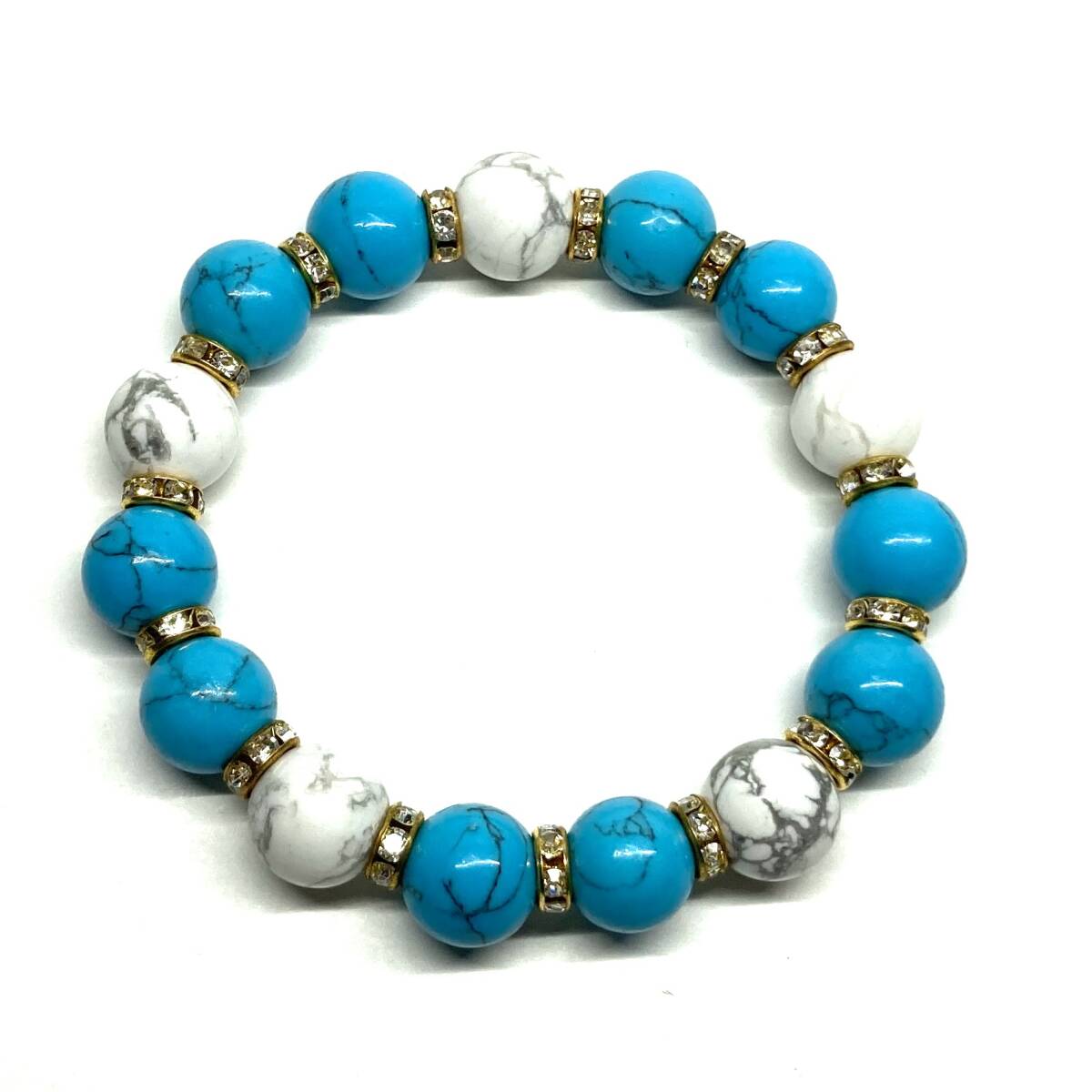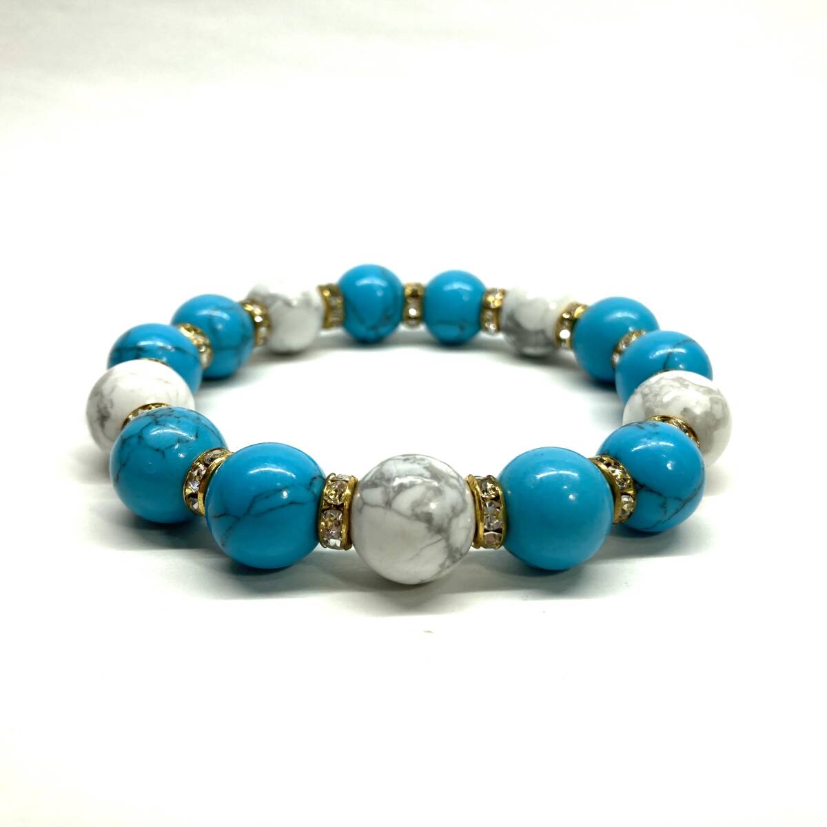 こちらは、ターコイズとハウライトを組み合わせたパワーストーンブレスレットです。間にはロンデルを挟み高級感あるデザインに仕上げております。石大きさは12mm玉を使用して内径約18cmです。気になる方は是非この機会にどうぞ。