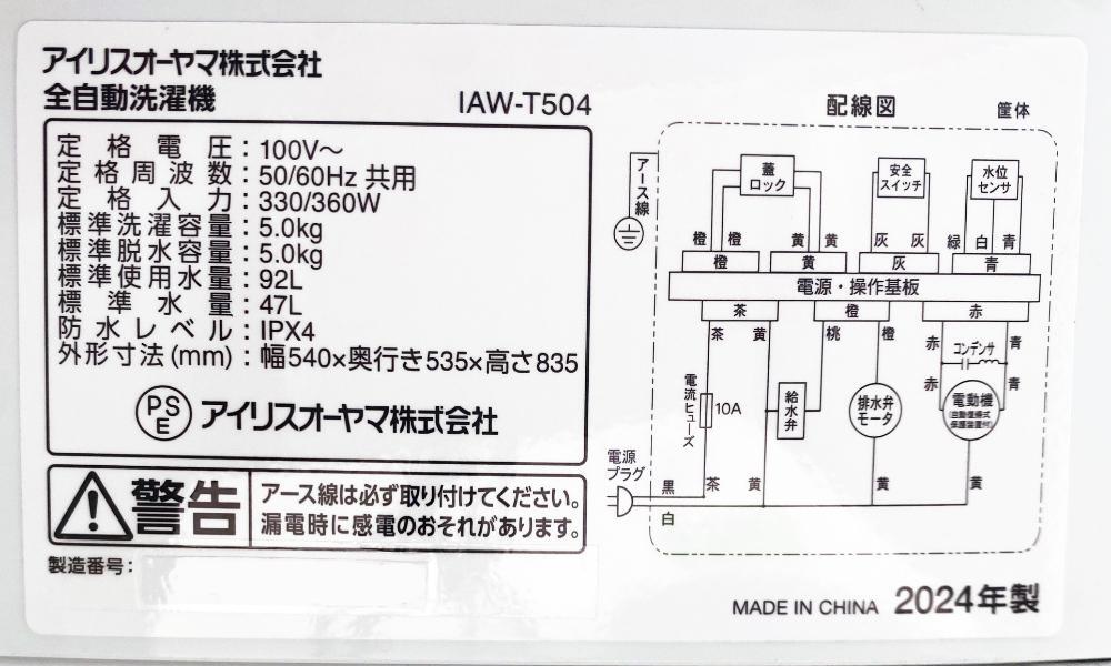 ★引き取りの大歓迎!! ご本人様が直接引取の場合、2,000円値引きます!! 是非お越しください♪ ★お取り置きOK!★ 3ヶ月間までは、無料でお取り置きできます! もしそれ以上の期間をご希望の方は、事前にご相談ください♪ ★送料無料★2024年製★極上超美品 中古★アイリスオーヤマ 5kg 風乾燥で干し時間短縮!!汚れに強いステンレス槽 洗濯機【IAW-T504】FWDF ※基本付属品は、洗濯機本体+給水ホース+排水ホースのみです。 ※その他付属品がある場合は、写真に写っているものが全てとなります。 ◆3回一通りの動作確認もしており、動作良好です。 ◆他にも出品しており、ご覧いただければわかりますが、細かすぎるかもしれませんが、私が気が付いたキズ等に関して、できる限りアップ写真を掲載しております。こちらの商品に関しては、私が見る限りで申し訳ございませんが、傷や汚れ等なく、全体的にはとても綺麗で、極上超美品だと思います。 ※但し、中古品の為、私の気づかないキズ・汚れ等あるかもしれませんので、気になる方はご遠慮ください。 是非、ご検討をお願いします。 【商品説明】 【このコンパクトさが、ちょうどいい】 既存品(※IAW-T451)4.5kg→5kg。 サイズはそのまま、容量UP。 せまい部屋にもぴったりな洗濯機。 【ゆとりをつくる、低めの設計】 本体高さ約83.5cm。 上部のスペースを確保し洗濯物が取り出しやすいよう、高さを抑えた設計(※既存品IAW-T501・IAW-T502ENと比較した場合)。 タオルやシーツなど、長さのある洗濯物も取り出しやすい。 洗濯機上にゆとりがあるから、ラックなどで空間を有効活用できて狭い場所でも使いやすい。 また省スペースな折りたたみ式のふたで、ラックを設置していてもスムーズに開閉できる。 【2つの機能でお洗濯をサポート! 】 部屋干しモード:乾燥時間を短縮。部屋干しのニオイも抑える! 予約タイマー:洗濯終了時間を予約。待ち時間ゼロに! ◆部屋干しモード ヒーターを使わず風乾燥! しっかり水分を飛ばし、部屋干し時間を短縮! 生乾きのニオイを抑えます。 ◆予約タイマー 何時間後に洗濯を終了させたいか、タイマー予約できます。 最短:1時間後/最長:24時間後で予約可能。 起床時や帰宅時など、生活スタイルに合わせて予約! ◆えらべる洗濯コース6種類 標準:普段のお洗濯に。 つけおき:頑固な汚れ、ニオイが気になるときに。 お急ぎ:すすぎ1回で洗濯時間を短縮。 念入り:厚手の衣類を洗濯するときに。 毛布:2kgまでの毛布対応。すっきりキレイに。 ドライ:デリケートな衣類をやさしく洗濯。 ◆選べる水位4段階 水位は47L/34L/22L/13L(手動)の4段階。 洗濯物の量にあわせて水位設定ができます。 少量洗いもできて便利。 ◆いつもキレイな洗濯槽 丈夫で汚れに強いステンレス槽。 キレイを保つ2つのコースも。 槽洗浄コース:見えない汚れもお手入れ簡単。 槽乾燥コース:洗濯後に行うとカビ予防に。 ◆あんしんチャイルドロック 『洗い』と『すすぎ』の2つのボタンを同時押し。 電源が入っている間、ふたをロックします。 ◆シンプル操作パネル ◆投入口 洗剤投入ケース、漂白剤投入口、柔軟剤投入口があります。 メーカー:アイリスオーヤマ/IRISOHYAMA 製造年:2024年 標準洗濯容量:5.0kg 標準脱水容量:5.0kg 標準使用水量:92L 標準水量:47L 防水レベル:IPX4 外形寸法(cm):幅約54×奥行約53.5×高さ約83.5 質量:約28kg 詳しくはこちら↓ ◆動作保証しておりますので、商品到着後3日以内に落札後の商品お取引画面から、動作不良等の内容をメッセージ連絡頂きましたら、初期不良対応は致します。但し、電源が入らない、全く稼働しない致命的な不具合に限ります。 ◆簡易清掃を行っております。 当方としては、清掃を行っておりますが、あえて簡易清掃と言わさせていただきます。 神経質な方や、新品同等のレベルをお求めの方、気になる方はご遠慮ください。 ◆その他、素人なりに慎重に確認したつもりですが、中古品の為、私の気づかない傷や汚れ等あるかもしれません。 専門的・神経質な細かな点までの対応はできませんので、基本的にノークレーム・ノーリターンでお願いします。 ※下記内容を最後まで、必ずお読み下さい。 ご入札・落札の際は、ご了承頂いたものとみなします。 注意事項★☆★☆★☆★☆★☆★☆★☆★☆★☆★☆★☆★☆★☆★☆ ●ヤフオクシステム改定に伴い、「 受取連絡 」が非常に重要となりますので、商品到着後24時間以内に受取連絡された方のみ、初期不良対応・保証対象とさせていただきます。 ●私としてで申し訳ございませんが、できる限り誠意ある対応を心がけているつもりですが、顔の見れないお取引が故に色々な方がおり、また人それぞれ感性など異なりますので、ところどころ、あえてと記載させて頂いております。 ●初期不良対応・保証に関して、お届け先へ商品到着後、3日以内が保証対象となります。 ●商品が届いたご住所で動作確認等行ってください。移動しますと保証対象外になります。 ●万が一、商品に不具合等