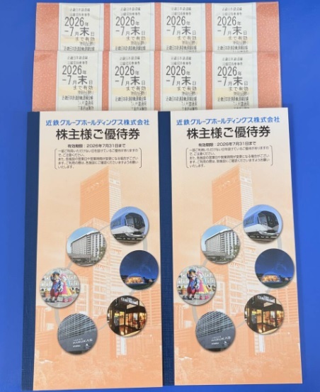 近鉄グループホールディングスの株主優待の近畿日本鉄道線沿線招待乗車券8枚と優待冊子2冊になります。