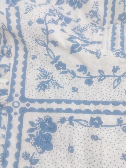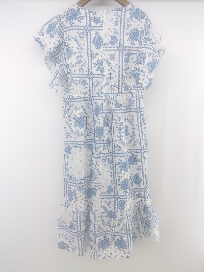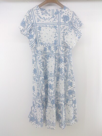 ◇ ノーブランド 総柄 フリル 半袖 膝下丈 ワンピース ホワイト ライトブルー系 レディース E