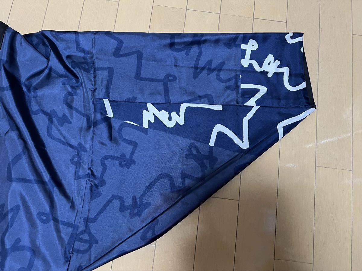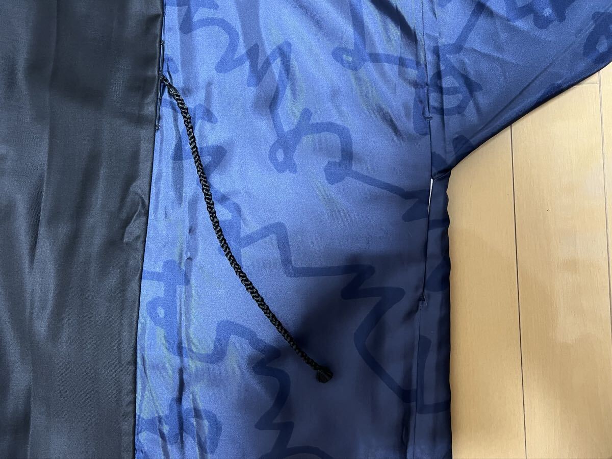 艶のある青の柄面と、使いやすい黒の組み合わせで、リバーシブルで着用できます。数回着用しホームクリーニング後保管しておりました。