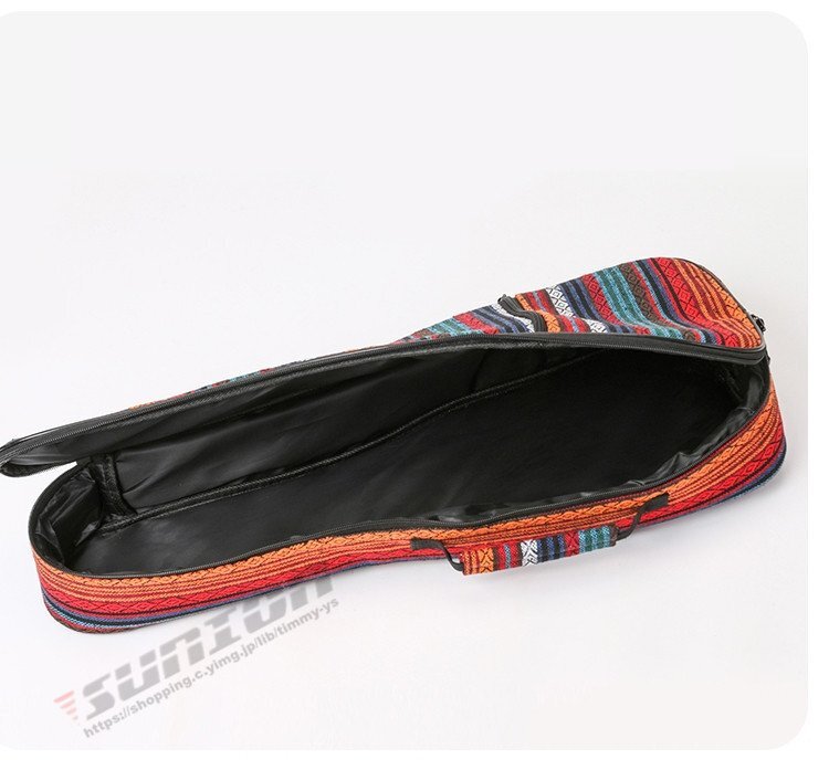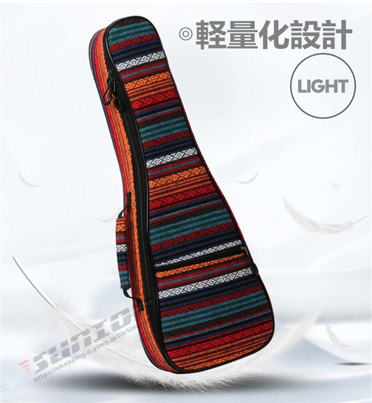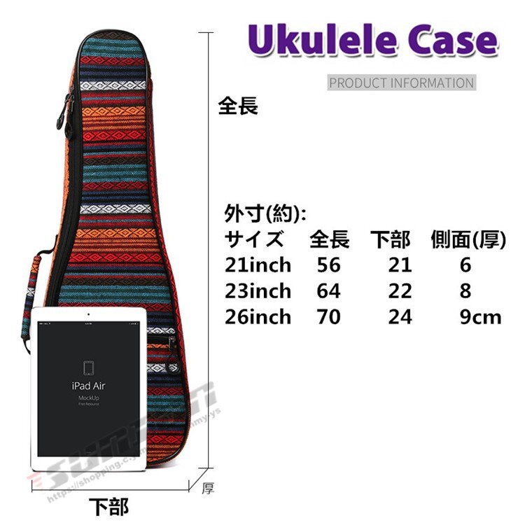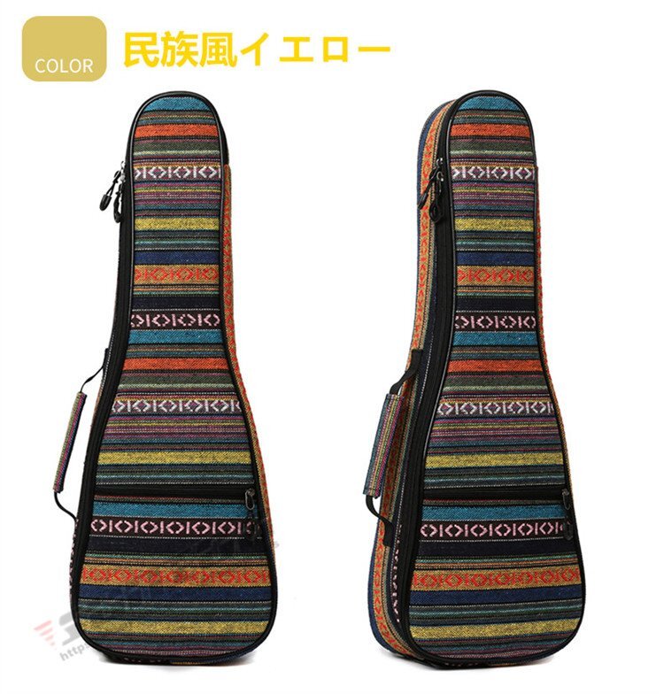 【商品特徴】■ボディーに軽量かつ堅牢ウクレレケース■保護能力の高いクッションを採用し、大切な機材を運搬時のダメージから守るウクレレ用バッグ。■優れたクッション性と持ち運びやすい重量感を実現。■ダブルジッパーで開閉ラクラク 【商品スペック】●外装生地/防水性オックスフォード生地●カラー 民族風レッド 民族風ブルー 民族風イエロー●外寸(約):サイズ 全長 下部 側面(厚)21inch 56   21   623inch 64   22   826inch 70   24   9cm※画像はイメージです。楽器本体は付属しておりません。※楽器のデザイン等により対応サイズ内でも入らない場合がございますのでご注意ください。
