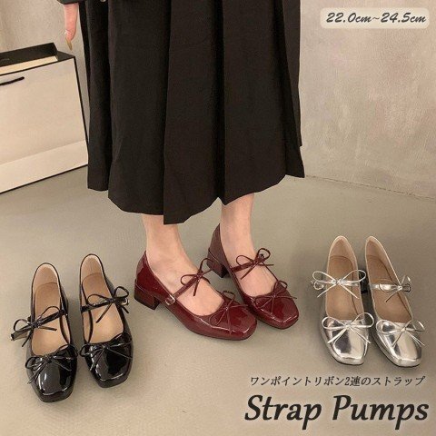 ・ツヤのある合皮素材が高級感を演出する2連ストラップパンプス。